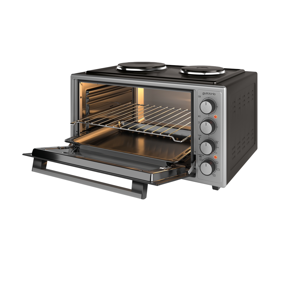Guzzanti GZ 4541 elektrická trouba kombinuje prostornou pečicí troubu s praktickými plotýnkami, díky čemuž se stává ideálním řešením pro domácnosti, chaty i menší kuchyně. Nabízí velký vnitřní objem 45 litrů, který poskytuje dostatek prostoru i pro přípravu rozměrnějších jídel, zatímco turbo funkce s rovnoměrnou cirkulací horkého vzduchu zajišťuje perfektní propečení. Elegantní matný černý povrch a šedý čelní panel dodávají troubě moderní vzhled.Kromě pečení umožňuje trouba také vaření díky dvěma plotýnkám – menší 145 mm s výkonem 1000 W a větší 180 mm s výkonem 1500 W. O kvalitní výsledky pečení se starají horní topné těleso 700 W a spodní topné těleso 900 W, teplota je navíc plynule nastavitelná v rozsahu 45–250 °C. K dispozici je i program pro přípravu domácího jogurtu a praktická funkce rozmrazování.Vnitřní prostor trouby je vybaven vnitřním osvětlením, smaltovaným povrchem pro snadnou údržbu a výškově nastavitelným pečicím plechem. Nechybí ani smaltovaný pečicí plech, Cr-Ni rošt a žáruvzdorná dvoustěnná skleněná dvířka se silikonovým těsněním. Spotřebič splňuje standardy předpisu A13, který upravuje účinnost a povrchovou teplotu.Parametry: objem trouby: 45 l turbo funkce: ano, rovnoměrná cirkulace horkého vzduchu plotýnky: 145 mm (1000 W) a 180 mm (1500 W) topná tělesa: horní 700 W, spodní 900 W teplotní rozsah: 45–250 °C funkce: program pro jogurt, rozmrazování časovač: 90 min vnitřní osvětlení: ano vnitřní povrch: smaltovaný, snadno udržovatelný příslušenství: smaltovaný pečicí plech, Cr-Ni rošt dvířka: dvoustěnná žáruvzdorná skla, silikonové těsnění norma: v souladu s předpisem A13 design: šedý čelní panel, matný černý povrch napájení: 220–240 V, 50–60 Hz příkon: 3600 W vnější rozměry (V × Š × H): 355 × 590 × 465 mm vnitřní rozměry (V × Š × H): 258 × 439 × 407 mm