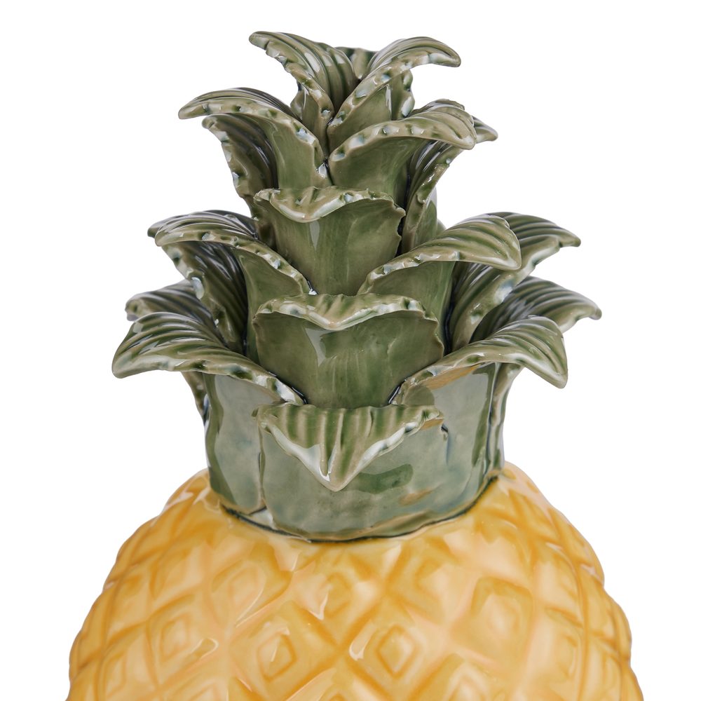 Materiál: Kamenina Rozměry: Výška: 23 cm, Šířka: 12 cm, Hloubka: 12 cm Dekorativní ananas PINA COLADA vnese do vašeho domova skutečnou tropickou atmosféru. Jeho zářivě žlutá barva a detailní tvar se stanou ústředním bodem v kuchyni, na jídelním stole nebo dokonce v obývacím pokoji. Vyroben z kameniny, je to stabilní a odolný dekorativní předmět, který v každé místnosti vytvoří veselou letní atmosféru.