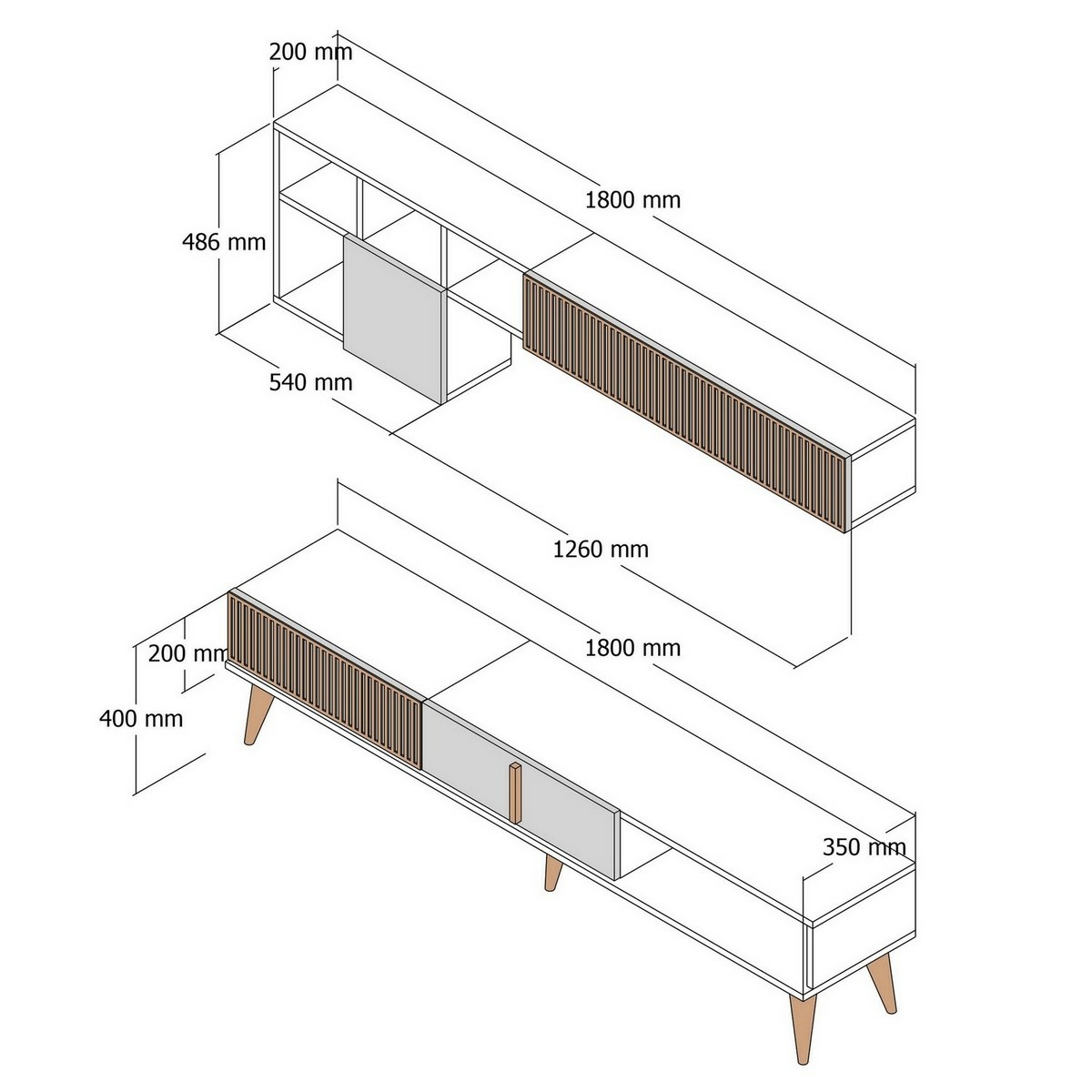 Televizní stěna Milen Walnut and Cream je moderní a elegantní řešení pro obývací pokoj, které zaujme jemnou kombinací ořechového dekoru a krémových prvků. Světlý kontrast působí lehce a nadčasově, díky čemuž se sestava snadno sladí s moderním, skandinávským i klasicky laděným interiérem.Sestava je vyrobena ze 100% melaminem potažené dřevotřískové desky o tloušťce 18 mm, která zajišťuje pevnost, stabilitu a dlouhou životnost. Televizní stolek doplněný nástěnnou policí nabízí dostatek prostoru pro televizi, multimediální zařízení i dekorace. Plastové nohy o výšce 20 cm dodávají celé sestavě lehkost a zároveň usnadňují úklid pod nábytkem.Parametry a specifikace: materiál: 100% melaminem potažená dřevotřísková deska tloušťka: 18 mm rozměry TV stolku: 180 × 40 × 35 cm rozměry nástěnné police: 180 × 48,6 × 20 cm výška nohou: 20 cm barva: ořech / krémová
