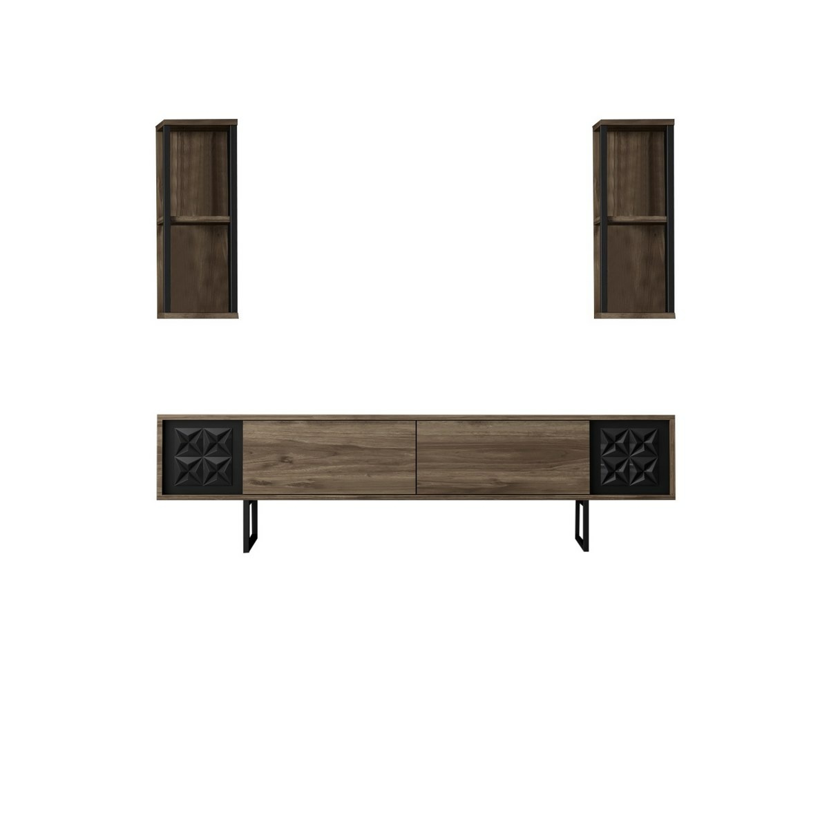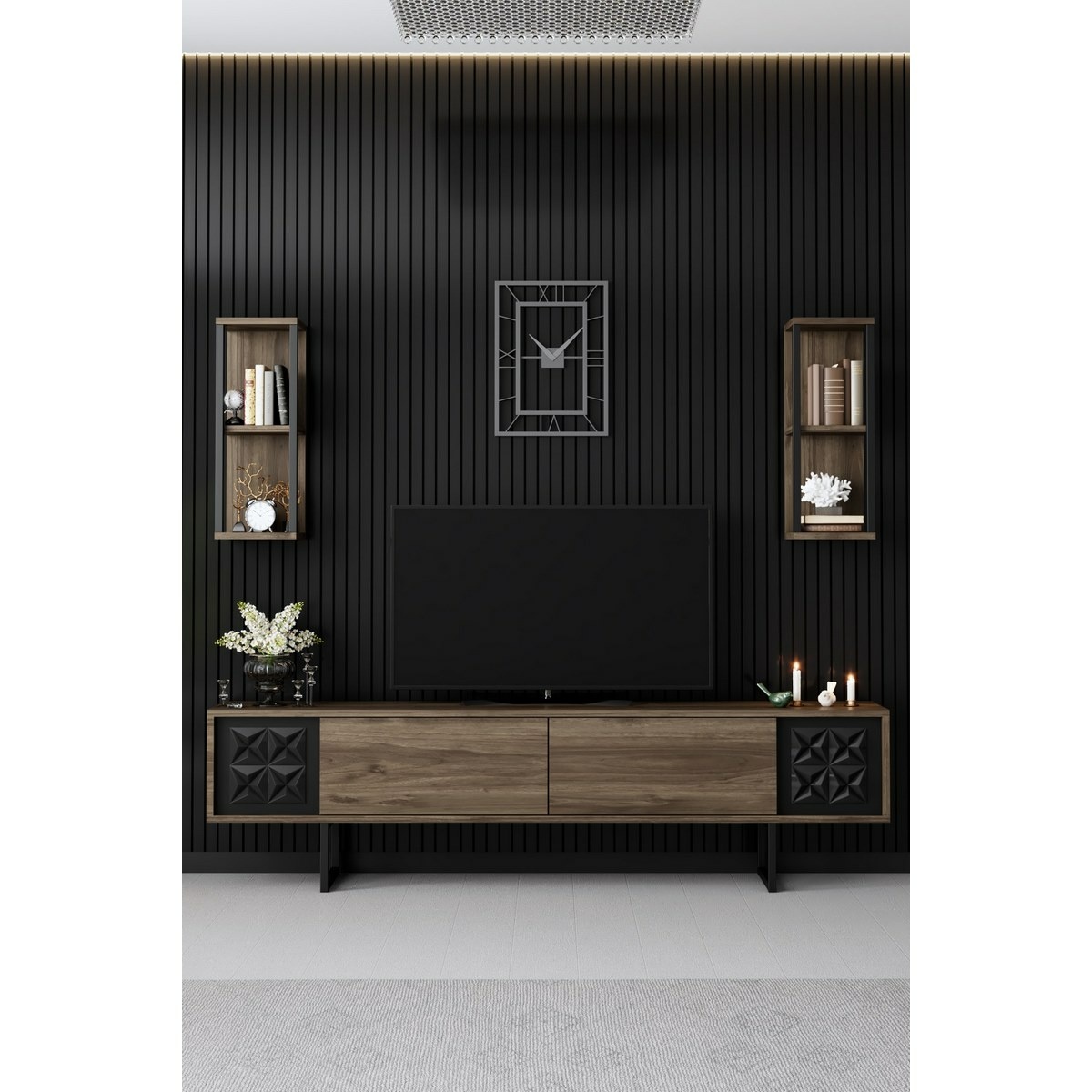 Televizní stolek s policemi Line Walnut and Black nabízí moderní a elegantní vzhled v kombinaci dekoru ořechu a černé barvy, která dodává interiéru teplo a zároveň výrazný kontrast. Čisté linie a otevřená konstrukce z něj dělají výrazný, ale praktický prvek obývacího pokoje.Sestava se skládá z prostorného televizního stolku a dvou nástěnných polic, které poskytují dostatek úložného prostoru pro elektroniku, knihy i dekorace. Otevřené řešení podporuje přehlednost a uspořádaný vzhled zábavní zóny.Korpus je vyroben ze 100% melaminem potažené dřevotřísky o tloušťce 18 mm, která zajišťuje pevnost a dlouhou životnost. Kovové nožky s výškou 18 cm dodávají stabilitu a podtrhují moderní charakter celé sestavy.Parametry a specifikace: materiál: 100% melaminem potažená dřevotříska tloušťka desky: 18 mm nožky: kovové výška nohou: 18 cm rozměry TV stolku: 180 × 48 × 30 cm rozměry nástěnných polic (2 ks): 22 × 60 × 21 cm dekor: ořech / černá