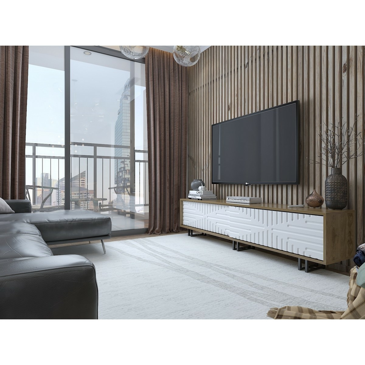 Televizní stolek Askak White přináší moderní a čistý design, který se snadno začlení do současného obývacího pokoje. Kombinace bílé barvy a dubového dekoru působí elegantně a zároveň příjemně zútulňuje prostor.Stolek nabízí dostatek úložného prostoru díky policím a uzavíratelným částem, které umožňují přehledné uložení elektroniky, médií i příslušenství. Dvířka s membránovou povrchovou úpravou dodávají celku sofistikovaný vzhled a pomáhají udržet obsah skrytý. Možnost připevnění ke stěně podporuje čistý, vzdušný dojem a šetří místo.Konstrukce z 100% melaminem potažené dřevotřísky o tloušťce 18 mm v kombinaci s kovovým rámem zajišťuje stabilitu, pevnost a dlouhou životnost při každodenním používání.Parametry a specifikace: materiál: 100% melaminem potažená dřevotříska tloušťka desky: 18 mm konstrukce: kovový rám rozměry: 180 × 47,4 × 35 cm dvířka: membránová povrchová úprava barva: bílá / dub