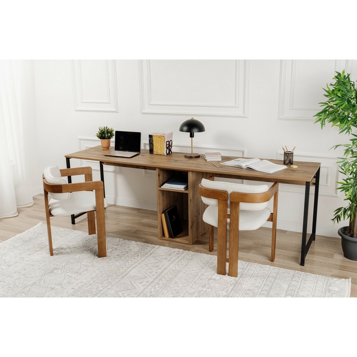 Pracovní stůl Twin Atlantic Pine and Black je mimořádně prostorný pracovní stůl, ideální pro sdílené pracoviště, domácí kancelář i studium. Kombinace dekoru borovice atlantic a černých kovových nohou vytváří moderní industriální vzhled, který se dobře uplatní v současných interiérech.Stůl je vyroben ze 100% melaminem potažené dřevotřískové desky o tloušťce 18 mm, která zajišťuje pevnost, stabilitu a snadnou údržbu. Kovové nohy s elektrostatickým práškovým nástřikem poskytují vysokou nosnost i při každodenním intenzivním používání. Díky četným policím a prostřední polici nabízí stůl dostatek úložného prostoru pro knihy, dokumenty i pracovní doplňky.Parametry: materiál: 100% melaminem potažená dřevotřísková deska tloušťka desky: 18 mm nohy: kovové, elektrostaticky práškově lakované šířka: 240 cm výška: 74 cm hloubka: 60 cm rozměr prostřední police: 34 × 50 cm barva / dekor: borovice atlantic / černá