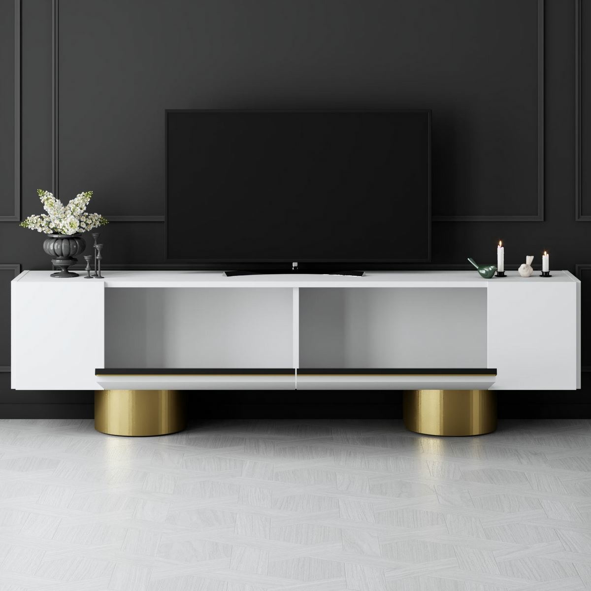 Televizní stolek Bohem White and Gold nabízí elegantní a moderní vzhled v kombinaci bílé barvy a zlatých detailů, které dodávají obývacímu pokoji svěží a luxusní charakter. Čisté linie spolu s kovovými nohami ve zlatém provedení vytvářejí jemný glamour akcent.Korpus je vyroben ze 100% melaminem potažené dřevotřísky o tloušťce 18 mm, která zajišťuje pevnost a dlouhou životnost. Díky své šířce poskytuje stolek dostatek prostoru pro televizor, elektroniku i dekorace a zachovává přehledné uspořádání zábavní zóny.Parametry a specifikace: materiál: 100% melaminem potažená dřevotříska tloušťka desky: 18 mm nohy: kovové výška nohou: 16 cm rozměry: 180 × 50 × 30 cm barva: bílá / zlatá