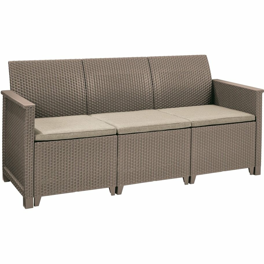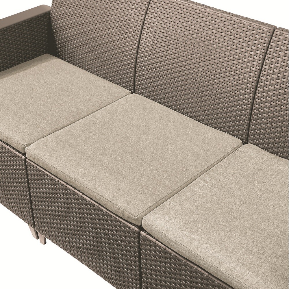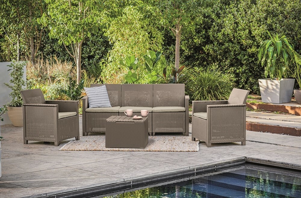 Tato sestava zahradního nábytku Elodie se perfektně hodí do každé zahrady. Je to moderní souprava v imitaci ratanu, která skvěle vynikne v moderním i retro stylu bydlení. Set se skláda ze dvou křesel, trojmístné pohovky a stolu, který zároveň slouží jako box. Konstrukce je vyrobena z kvalitního plastu, který je odolný vůči povětrnostním vlivům a nenáročný na údržbu. Součástí sady jsou polštáře z polybavlny, které zvyšují pohodlí při sezení a snadno se čistí. Velkou výhodou je velmi snadná montáž, jednotlivé díly se jednoduše zakliknou bez nutnosti použití nářadí. Rozměry jednotlivých prvků jsou přizpůsobeny pohodlnému sezení a praktickému využití v menších i větších exteriérech.Hlavní výhody produktu kompaktní sedací souprava vhodná i do menších prostor variabilní konfigurace sestavení podle potřeby ratanová textura s moderním vzhledem úložný stolek s pevnou deskou z resolitu snadná údržba a odolnost vůči venkovním vlivům velmi jednoduchá montáž bez nářadíObsah balení 1x třímístná pohovka 2x křeslo 1x úložný stolek sada polybavlněných polštářůParametry a specifikace typ sestavy: venkovní sedací souprava materiál konstrukce: plast s ratanovou texturou materiál desky stolku: resolit materiál polštářů: polybavlna rozměry křesla: 65 x 63 x 74 cm rozměry pohovky: 65 x 163 x 74 cm rozměry stolku: 55,5 x 55,5 x 38 cm montáž: zacvakávací systém bez nářadí údržba: snadno omyvatelný povrch