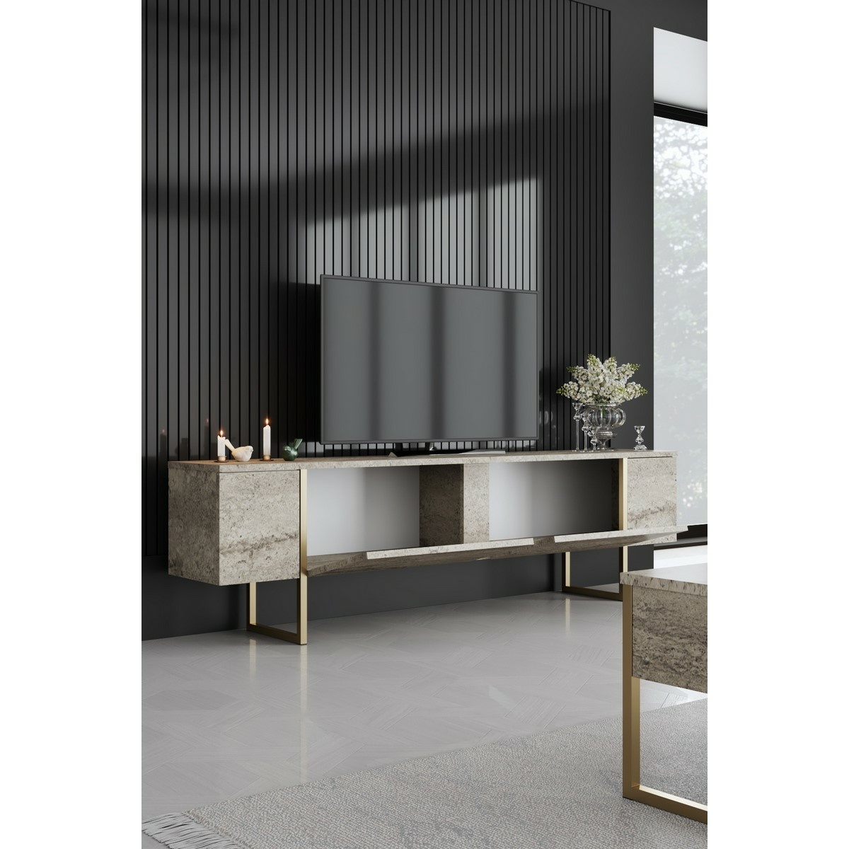 Televizní stolek Luxe Travertine and Gold je moderní a elegantní doplněk do obývacího pokoje, který zaujme luxusní kombinací travertinového dekoru a zlatých akcentů. Kontrast přírodního vzhledu a kovových detailů vytváří sofistikovaný celek, který se skvěle hodí do moderních i designově laděných interiérů.Stolek je vyroben ze 100% melaminem potažené dřevotřískové desky o tloušťce 18 mm, která zajišťuje pevnost, stabilitu a dlouhou životnost. Kovové nohy dodávají nábytku lehkost a spolehlivou oporu, zatímco praktický systém vedení kabelů pomáhá udržet zábavní zónu přehlednou a bez rušivých kabelů.Parametry a specifikace: materiál: 100% melaminem potažená dřevotřísková deska tloušťka: 18 mm nohy: kovové rozměry: 180 × 50 × 30 cm barva: travertin / zlatá
