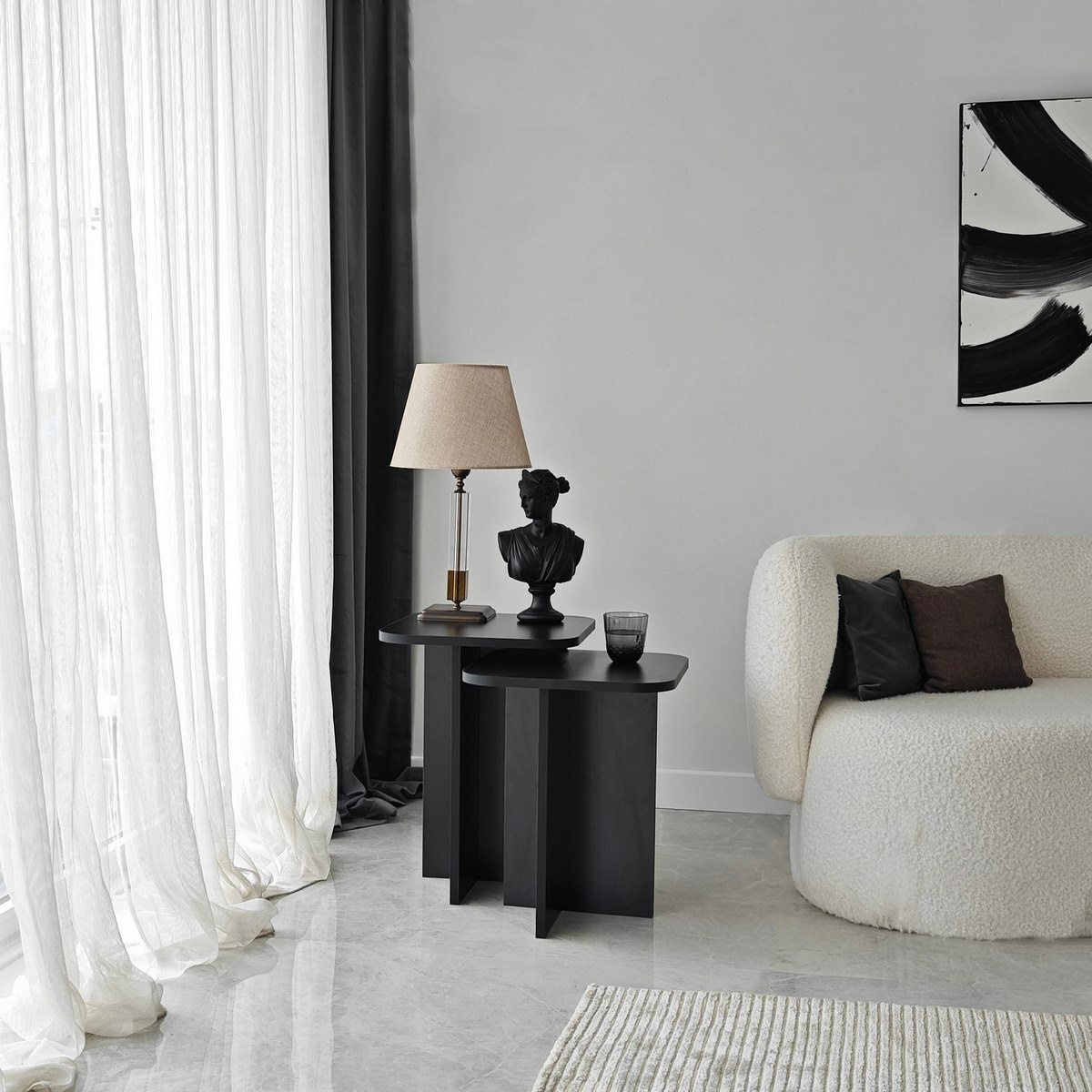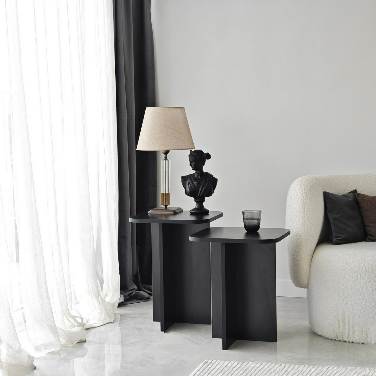Sada odkládacích stolků Blues Black, 2 ks je elegantním a praktickým doplňkem moderního interiéru. Díky čistým liniím, minimalistickému provedení a nadčasové černé barvě snadno zapadne do obývacího pokoje, ložnice i pracovního kouta. Stolky lze používat společně nebo samostatně podle aktuálních potřeb.Kvalitní zpracování z 100% melaminem potažené dřevotřísky zajišťuje dlhou životnost, odolnost proti poškrábání a snadnou údržbu. Rozdílná výška stolků přináší variabilitu využití a zároveň vytváří vizuálně zajímavý celek.Parametry a specifikace: materiál: 100% melaminem potažená dřevotříska tloušťka desky: 18 mm počet kusů v sadě: 2 ks rozměry menšího stolku: 40 × 50 × 40 cm (š × v × h) rozměry většího stolku: 40 × 55 × 40 cm (š × v × h) barva: černá