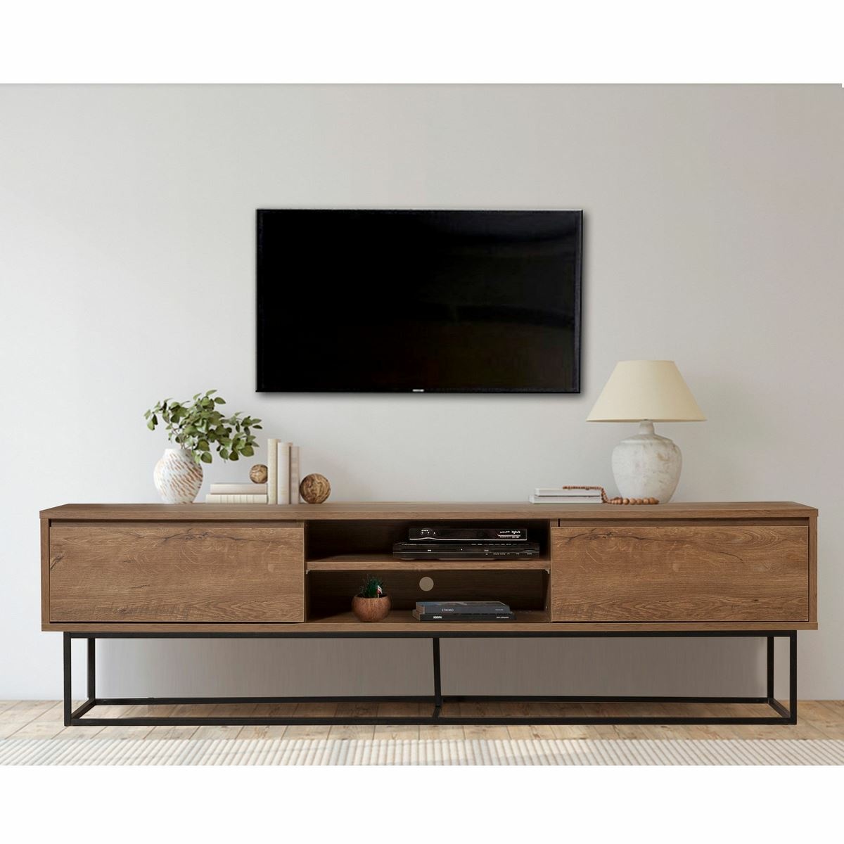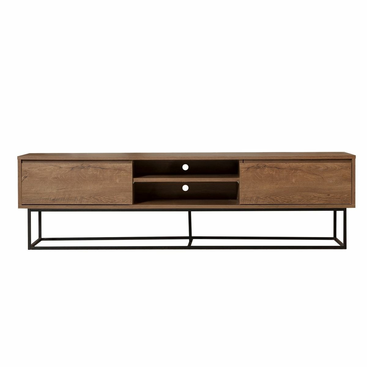 Televizní stolek Rodez Walnut and Black II zaujme moderním industriálním vzhledem, který kombinuje teplý ořechový dekor s kontrastní černou barvou. Elegantní linie a kovové prvky dodávají stolku výrazný charakter a činí z něj stylový doplněk moderních, loftových i industriálně laděných interiérů.Korpus je vyroben ze 100% melaminem potažené dřevotřísky o tloušťce 18 mm, která zajišťuje pevnost a dlouhou životnost. Kovový rám a kovové nohy poskytují stabilitu a podtrhují industriální styl. Praktický úložný prostor umožňuje přehledné uspořádání TV techniky i doplňků a stolek lze upevnit na stěnu pro vyšší bezpečnost.Parametry a specifikace: materiál: 100% melaminem potažená dřevotříska tloušťka desky: 18 mm konstrukce: kovový rám, kovové nohy rozměry stolku: šířka 180 cm, výška 50 cm, hloubka 40 cm rozměry střední police: šířka 60 cm, výška 16 cm výška nohou: 23 cm barva: ořech / černá