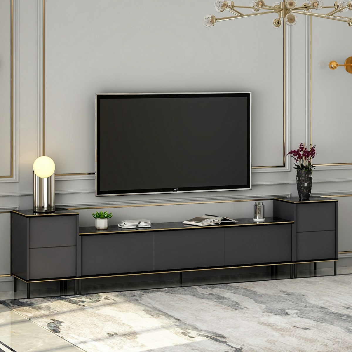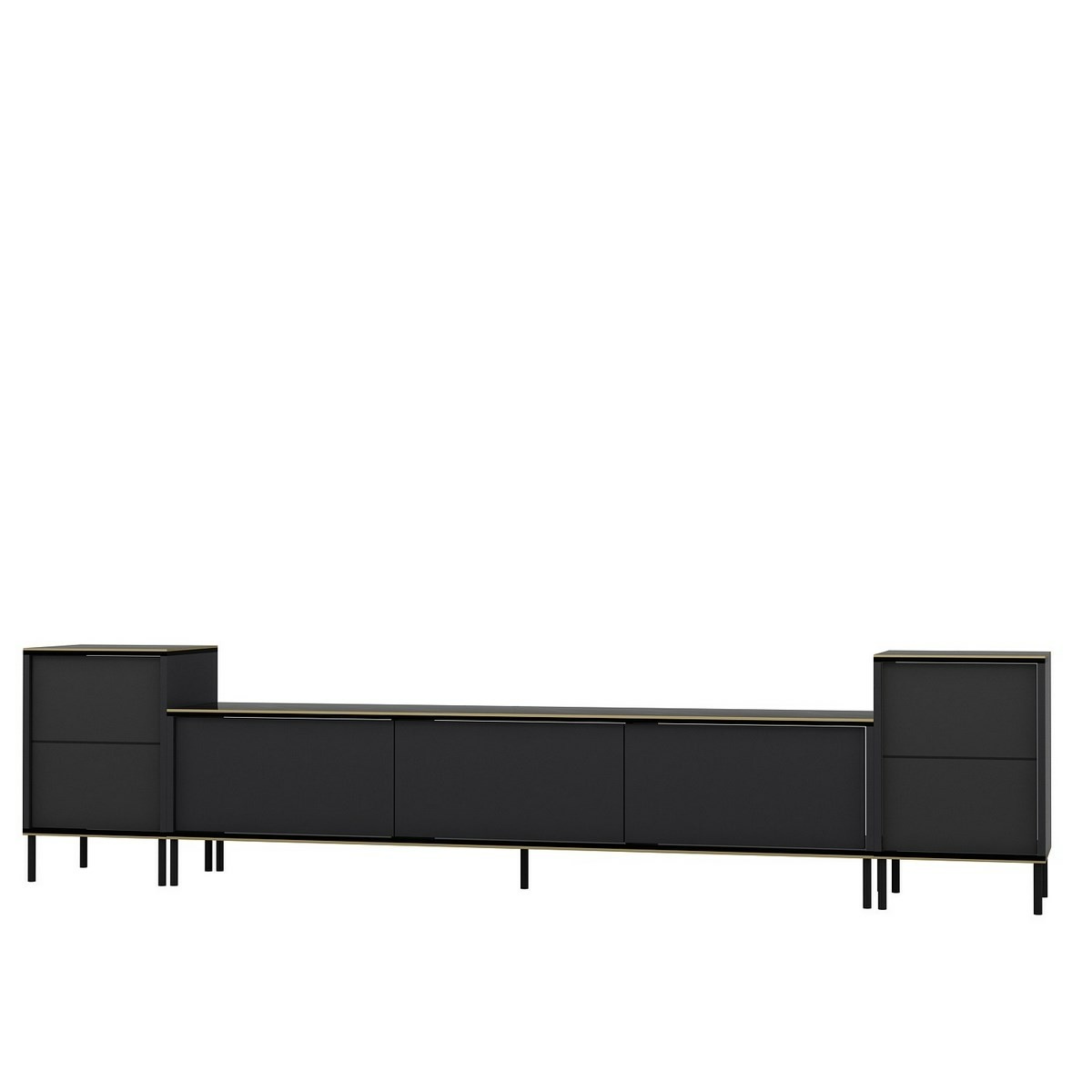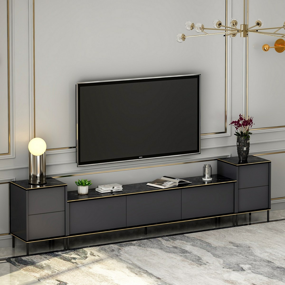 Televizní stolek se skříňkami Imej Anthracite je elegantní a praktické řešení pro moderní obývací pokoj. Antracitové provedení působí sofistikovaně a snadno se kombinuje s ostatním nábytkem, zatímco čisté linie dodávají interiéru moderní charakter. Set tvořený televizním stolkem a dvěma skříňkami nabízí dostatek prostoru pro elektroniku, příslušenství i další uložené předměty.Nábytek je vyroben ze 100% melaminem potažené dřevotřískové desky o tloušťce 18 mm, která zajišťuje pevnost, stabilitu a dlouhou životnost. Četné police umožňují přehlednou organizaci a možnost upevnění na stěnu přispívá k vyšší bezpečnosti i čistému vzhledu prostoru.Parametry a specifikace: materiál: 100% melaminem potažená dřevotřísková deska tloušťka: 18 mm rozměry TV stolku: 180 × 45,2 × 35 cm rozměry skříňky: 40 × 60 × 35 cm (2 ks) barva: antracitová