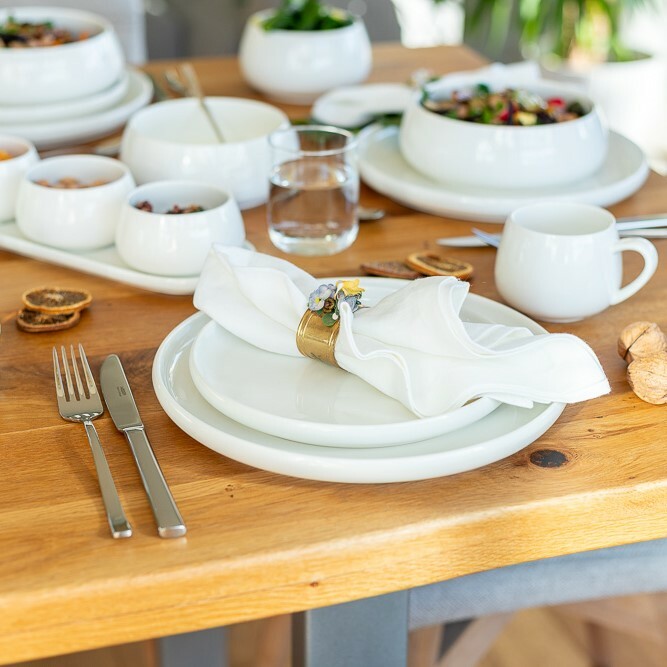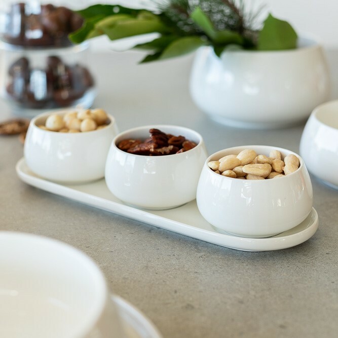 Servírovací sada misek s podtáckem TAYA od značky Mäser je elegantním a praktickým řešením pro stylové servírování drobných pochutin. Čisté linie a oblý tvar vytvářejí harmonický celek, který působí elegantně a přehledně. Sada v minimalistickém designu se přirozeně hodí na slavnostní stůl, rodinné posezení i každodenní stolování.Servírovací sada je vyrobena z kvalitního porcelánu, který vyniká hladkým povrchem, pevností a dlouhou životností. Materiál je příjemný na dotek a snadno se udržuje. Tři menší misky jsou ideální pro dipy, oříšky, olivy, omáčky nebo drobné dezerty. Oválný podtácek umožňuje přehledné a elegantní servírování všech misek pohromadě. Nádobí je praktické a snadno se udržuje – lze mýt v myčce nádobí a používat v mikrovlnné troubě.Sada je součástí kolekce TAYA, která zahrnuje talíře, misky, hrnky i další porcelánové nádobí ve stejném stylu. Díky tomu lze snadno vytvořit jednotně sladěné stolování od snídaně až po večerní pohoštění. Servírovací set je vhodný do domácností, pro návštěvy i jako vkusný dárek.Hlavní výhody produktu servírovací sada tří misek s podtáckem kvalitní porcelán s hladkým povrchem ideální pro dipy, omáčky a drobné pochutiny elegantní a přehledné servírování součást ucelené kolekce TAYA vhodné do myčky nádobí i mikrovlnné troubyObsah balení 3× miska 10 cm 1× podtácek 32 × 10,5 cm