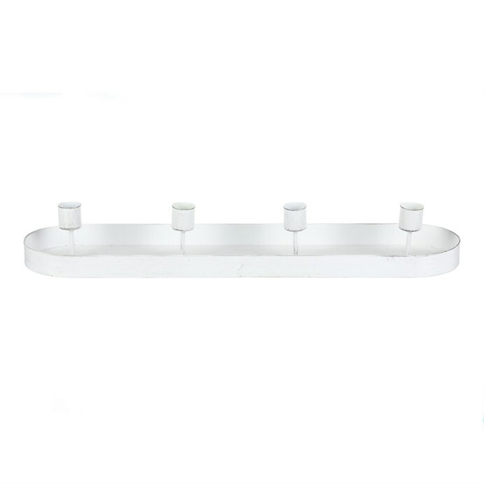 Kovový bílý svícen na čtyři kónické svíčky, v podobě elegantního oválného tácu, je ideálním doplňkem pro váš adventní stůl. Jeho prostý, a přesto vkusný design, dodá vaší sváteční výzdobě ten správný nádech elegance. Tento svícen je skvělým centrálním prvkem na vašem stole a zároveň vkusnou dekorací, která podtrhne vánoční magii a přinese do domova útulnou a slavnostní náladu.