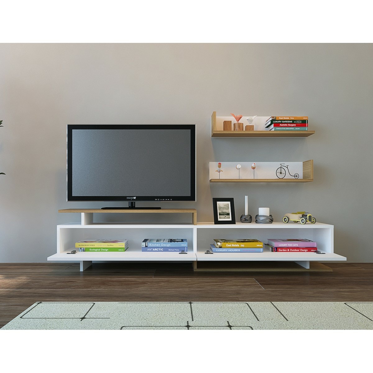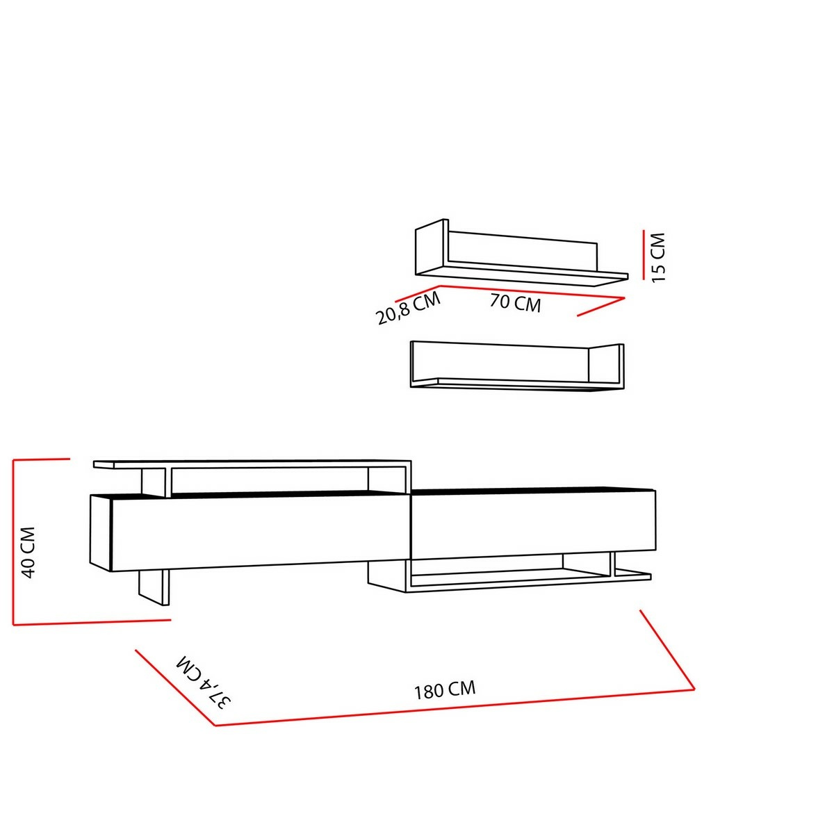 Televizní stolek s poličkami Ayaz White and Teak představuje moderní a praktické řešení pro stylově zařízený obývací pokoj. Spojení bílé barvy a dekoru teaku působí nadčasově, svěže a snadno se přizpůsobí různým interiérům.Televizní stolek nabízí dostatek úložného prostoru díky otevřeným policím, které jsou ideální pro uložení elektroniky, médií i dekorací. Součástí sestavy je také nástěnná polička, která rozšiřuje možnosti uspořádání a umožňuje vystavit knihy, fotografie nebo designové doplňky.Konstrukce z 100% melaminem potažené dřevotřísky o tloušťce 18 mm zajišťuje pevnost, stabilitu a dlouhou životnost při každodenním používání. Celek působí vzdušně, přehledně a podporuje organizovaný vzhled zábavní zóny.Parametry a specifikace: materiál: 100% melaminem potažená dřevotříska tloušťka desky: 18 mm rozměry televizního stolku: 180 × 40 × 37,4 cm rozměry nástěnné poličky: 70 × 15 × 20,8 cm úložný prostor: více polic barva: bílá / teak