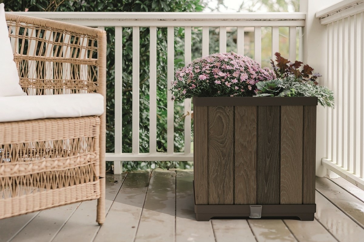 Květináč Deco Square přináší spojení moderního čtvercového tvaru, autentického vzhledu dřeva Decocoat a chytrých technologií, které usnadňují péči o rostliny. Povrch působí přirozeně a elegantně, přitom si zachovává jednotný vzhled bez viditelných nedokonalostí typických pro přírodní materiály. Díky tomu se květináč hodí jak do interiéru, tak na terasu, balkon nebo do zahrady, kde vytváří kultivované a harmonické prostředí.Použitá patentovaná technologie Decocoat zajišťuje realistický dřevěný efekt v kombinaci s vysokou odolností. Materiál je navržen pro dlouhodobé použití bez nutnosti údržby, odolává vlhkosti, změnám teplot i povětrnostním vlivům. Květináč si tak zachovává svůj vzhled po dlouhou dobu a je vhodný i pro náročnější podmínky.Součástí konstrukce je pokročilý zavlažovací systém, který automaticky udržuje optimální úroveň vlhkosti půdy a podporuje zdravý růst rostlin. Praktický ukazatel hladiny vody na přední straně umožňuje snadnou kontrolu zálivky a pomáhá zabránit přemokření. Sestavení je velmi rychlé a intuitivní, hotové během několika minut, takže květináč lze ihned začlenit do prostoru bez zbytečného čekání.Hlavní výhody produktu: realistický vzhled dřeva díky technologii Decocoat integrovaný zavlažovací systém pro optimální vlhkost půdy ukazatel hladiny vody pro snadnou kontrolu zálivky bezúdržbové a vysoce odolné provedení vhodné pro vnitřní i venkovní použití rychlá a jednoduchá montážObsah balení: 1x čtvercový květináč Deco 1x integrovaný zavlažovací systémParametry a specifikace: typ: květináč tvar: čtvercový materiál: plast s povrchovou úpravou Decocoat zavlažovací systém: ano ukazatel hladiny vody: ano použití: interiér i exteriér údržba: bezúdržbové provedení