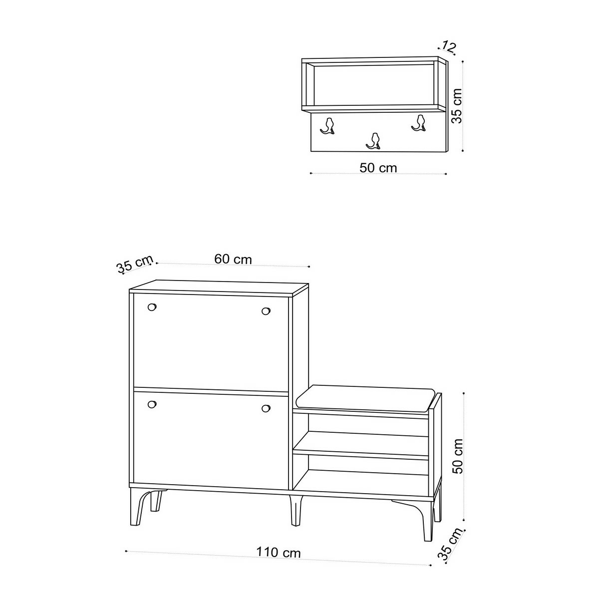 Předsíňová sestava Bred Oak je praktickým a elegantním řešením pro uspořádaný vstupní prostor. Kombinuje botník s dostatkem úložného místa a závěsný věšák, takže boty i svrchní oblečení budete mít vždy přehledně po ruce.Korpus je vyroben ze 100% melaminem potažené dřevotřísky o tloušťce 18 mm, která zajišťuje pevnost a dlouhou životnost. Dubový dekor působí přirozeně a nadčasově a snadno zapadne do moderního, industriálního i skandinávského interiéru. Četné police umožňují přehledné uložení obuvi, zatímco závěsný věšák nabízí praktické místo pro kabáty, šály a doplňky. Pro vyšší stabilitu lze sestavu připevnit ke zdi.Důležité informace: materiál: melaminem potažená dřevotříska tloušťka materiálu: 18 mm rozměry botníku: 110 × 35 × 92 cm rozměry věšáku: 50 × 12 × 35 cm úložný prostor: četné police nohy: plastové montáž: možnost připevnění ke zdi barva/dekor: dub