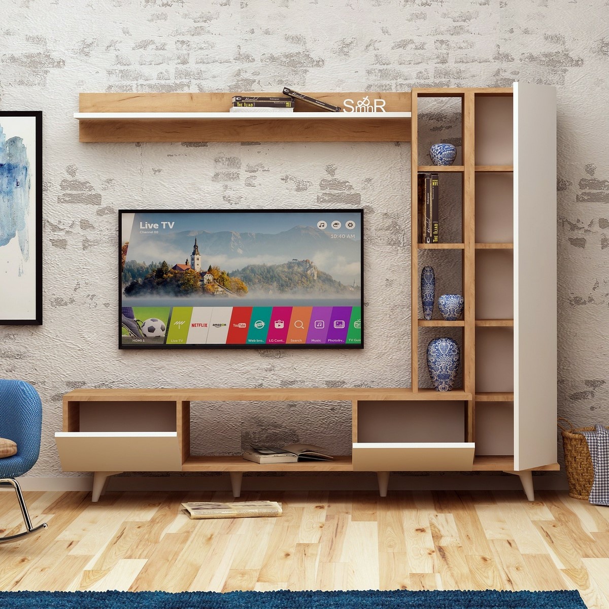 Televizní stěna Rambuty Oak and White nabízí moderní a elegantní řešení pro obývací pokoj v nadčasové kombinaci dubového dekoru a bílé barvy. Čisté linie a vyvážené proporce působí svěže a přehledně, díky čemuž se stěna snadno začlení do moderních i skandinávsky laděných interiérů.Konstrukce je vyrobena ze 100% melaminem potažené dřevotřísky o tloušťce 18 mm, která zajišťuje pevnost a dlouhou životnost. Sestava zahrnuje televizní stolek, vysokou skříňku i nástěnnou polici a poskytuje praktický úložný prostor pro TV techniku, dekorace i doplňky. Plastové nožky zajišťují stabilitu a jednotlivé části lze upevnit na stěnu pro vyšší bezpečnost a vzdušnější vzhled.Parametry a specifikace: materiál: 100% melaminem potažená dřevotříska tloušťka desky: 18 mm nožky: plastové rozměry TV stolku: šířka 170 cm, výška 37 cm, hloubka 37 cm rozměry skříňky: šířka 50 cm, výška 154 cm, hloubka 25 cm rozměry nástěnné police: šířka 140 cm, výška 15 cm, hloubka 25 cm výška nohou: 12 cm barva: dub / bílá