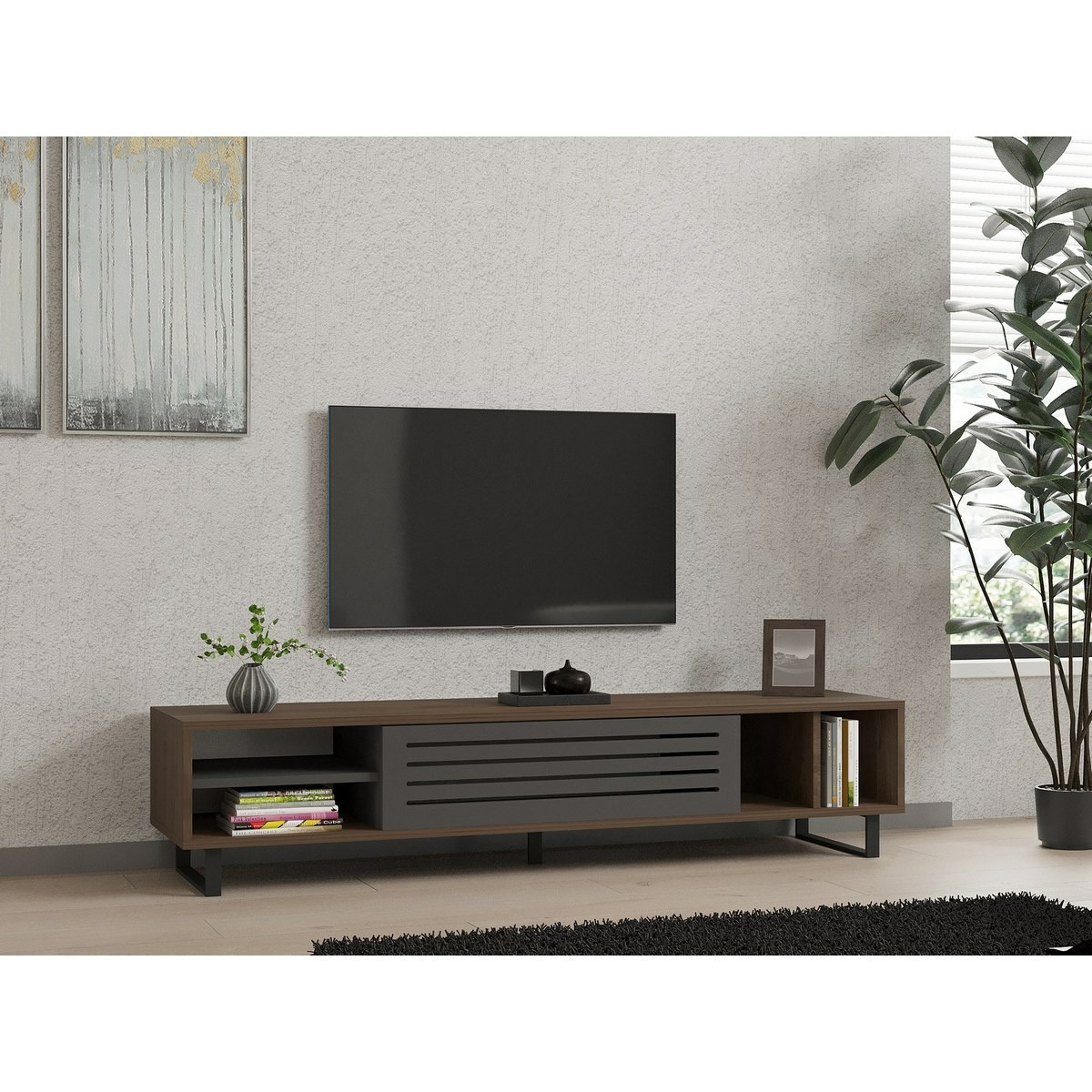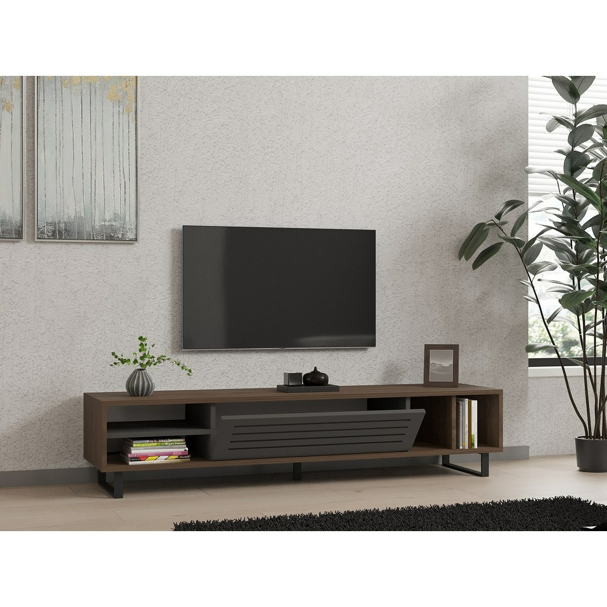 Televizní stolek Eray Walnut and Anthracite je stylovým řešením pro moderní obývací prostor, kde se snoubí industriální elegance s praktickým využitím. Kombinace ořechového dekoru a antracitové barvy působí nadčasově a dodává interiéru výrazný, ale vyvážený charakter.Stolek je vyroben ze 100% melaminem potažené dřevotřísky o tloušťce 18 mm, která zajišťuje pevnost a dlouhou životnost. Díky otevřeným policím a úložným prostorům nabízí dostatek místa pro televizi, herní konzole i další elektroniku, aniž by působil robustně nebo těžce.Kompaktní proporce z něj dělají ideální volbu i do menších místností, kde oceníte přehledné uspořádání a čistý vzhled bez zbytečného nepořádku.Technické údaje: materiál: 100% melaminem potažená dřevotříska tloušťka: 18 mm rozměry: 160 × 35 × 40 cm barva: ořech a antracit