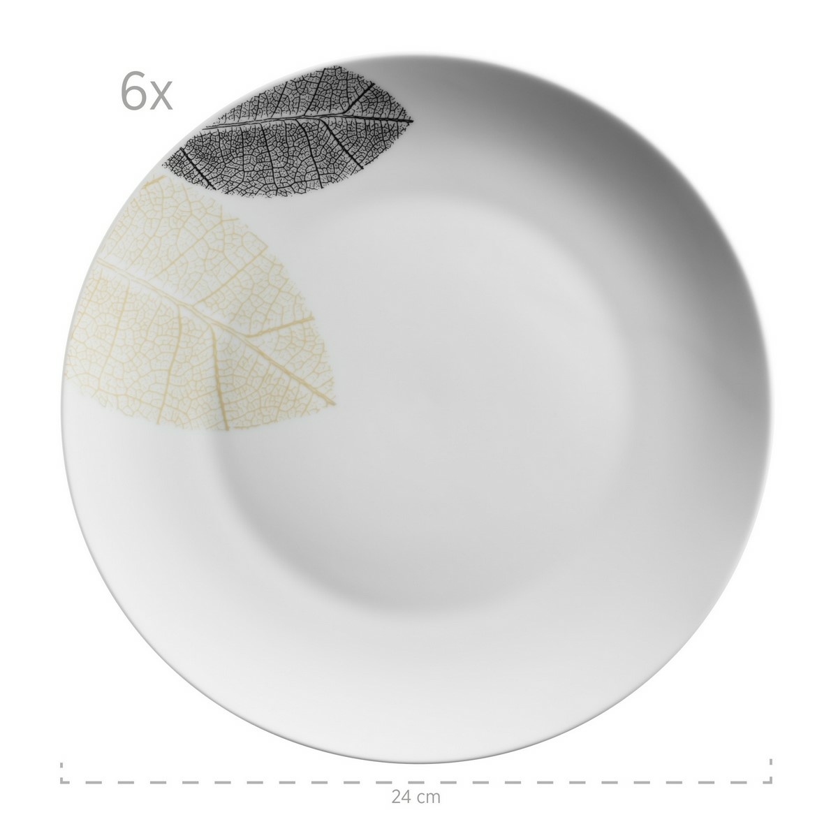 Jídelní sada nádobí JONA od značky Mäser je elegantní porcelánová kolekce určená pro 6 osob, která zaujme jemným přírodním dekorem inspirovaným strukturou listů. Kombinace čistého bílého podkladu s decentními motivy v tlumených tónech působí lehce, harmonicky a nadčasově. Sada je vhodná pro každodenní stolování i slavnostnější příležitosti, kdy chcete stůl prostřít v klidném a vkusném stylu.Použitý porcelán je hladký, příjemný na dotek a zároveň dostatečně odolný pro běžné používání. Mělké talíře jsou ideální pro hlavní chody, dezertní talíře poslouží na menší pokrmy či sladké tečky a hluboké talíře jsou vhodné na polévky, těstoviny i saláty. Součástí sady jsou také šálky na kávu s podšálky, které dotvářejí jednotný vzhled stolování.Sada JONA je navržena s důrazem na praktičnost a snadnou údržbu. Porcelánové nádobí je vhodné do mikrovlnné trouby, což oceníte při každodenním používání. Nádobí lze mýt v myčce, ale pro dlouhodobé zachování dekoru doporučujeme ruční mytí. Díky jemnému a univerzálnímu dekoru lze tuto sadu snadno kombinovat s dalšími doplňky nebo jiným bílým porcelánem.Hlavní výhody produktu porcelánová sada pro 6 osob jemný přírodní dekor s nadčasovým vzhledem kompletní řešení pro hlavní chody i kávové servírování hladký povrch a příjemná manipulace vhodné do mikrovlnné trouby lze mýt v myčce nádobí, ale doporučujeme ruční mytíObsah balení 6× kávový šálek 220 ml 6× podšálek 15 cm 6× dezertní talíř 20,5 cm 6× hluboký talíř 20,5 cm 6× mělký talíř 24 cm