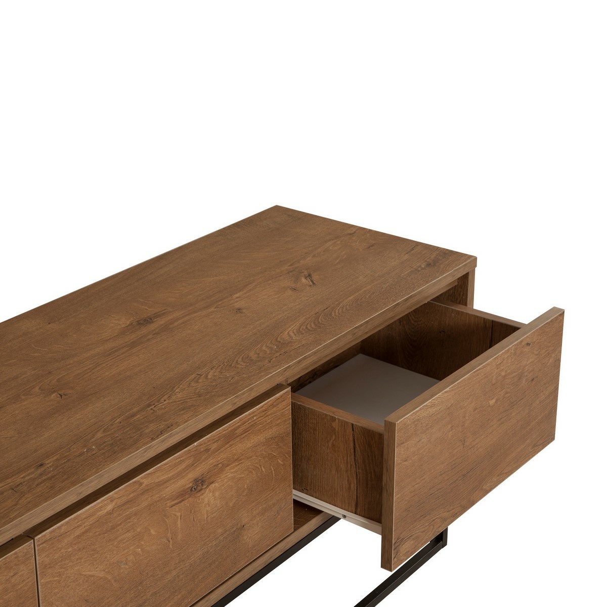 Televizní stolek Milo Walnut and Black I je moderní a elegantní doplněk do obývacího pokoje, který zaujme kombinací ořechového dekoru a černého kovového rámu. Nadčasový design s industriálním nádechem působí lehce, přitom pevně, a snadno se začlení do moderních, loftových i minimalistických interiérů.Stolek je vyroben ze 100% melaminem potažené dřevotřískové desky o tloušťce 18 mm, která zajišťuje vysokou odolnost a dlouhou životnost. Kovový rám a nohy dodávají konstrukci stabilitu a vizuální lehkost, zatímco otevřené police a střední přihrádka poskytují praktický prostor pro televizní techniku, herní konzole i dekorace.Parametry a specifikace: materiál: 100% melaminem potažená dřevotřísková deska tloušťka: 18 mm konstrukce: kovový rám rozměry: 140 × 50 × 40 cm střední police: 47 × 16 cm výška nohou: 23 cm barva: ořech / černá