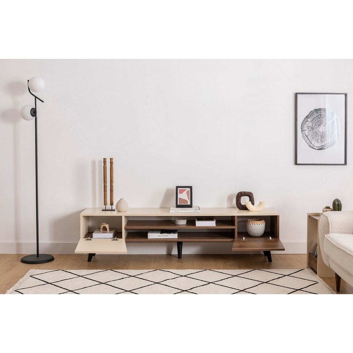 Televizní stolek Clark Walnut and Beige spojuje elegantní ořechový dekor s jemnou béžovou barvou, díky čemuž působí teple, klidně a nadčasově. Čisté linie a vyvážené proporce z něj dělají přirozený středobod obývacího pokoje.Stolek nabízí praktický úložný prostor pro multimediální techniku i doplňky a pomáhá udržet zábavní zónu přehlednou. Konstrukce z 100% melaminem potažené dřevotřísky o tloušťce 18 mm zajišťuje pevnost a dlouhou životnost, zatímco kovový rám dodává stabilitu a moderní akcent.Parametry a specifikace: materiál: 100% melaminem potažená dřevotříska tloušťka desky: 18 mm konstrukce: kovový rám rozměry: 180 × 45 × 37 cm barva: ořech / béžová