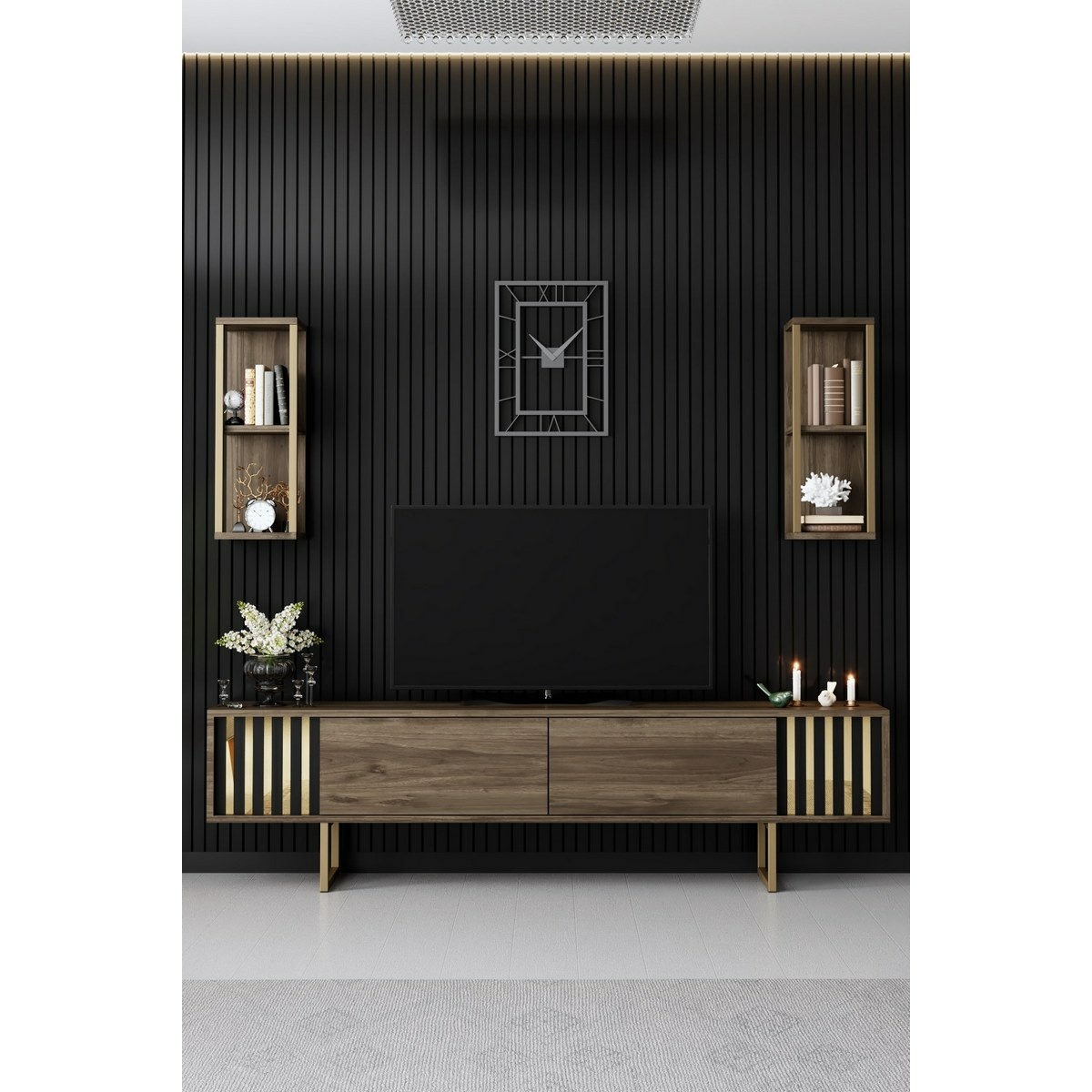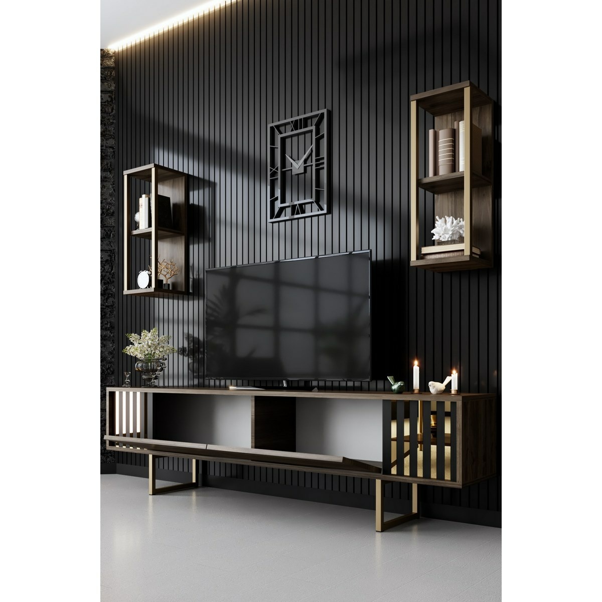 Televizní stolek s policemi Linie Walnut and Gold zaujme elegantním designem a luxusní kombinací ořechového dekoru se zlatými detaily. Čisté linie a kovové nohy dodávají stolku moderní a vzdušný vzhled, který skvěle zapadne do současných interiérů.Konstrukce ze 100% melaminem potažené dřevotřísky o tloušťce 18 mm zajišťuje pevnost a dlouhou životnost. Prostorná horní deska poskytuje dostatek místa pro televizi i elektroniku, zatímco dvě nástěnné police poslouží k vystavení dekorací nebo uložení drobností.Technické detaily: materiál: 100% melaminovaná dřevotříska tloušťka: 18 mm nohy: kovové, výška 18 cm rozměry stolku: 180 × 48 × 30 cm nástěnné police: 2 ks, 22 × 60 × 21 cm barva: ořechová a zlatá
