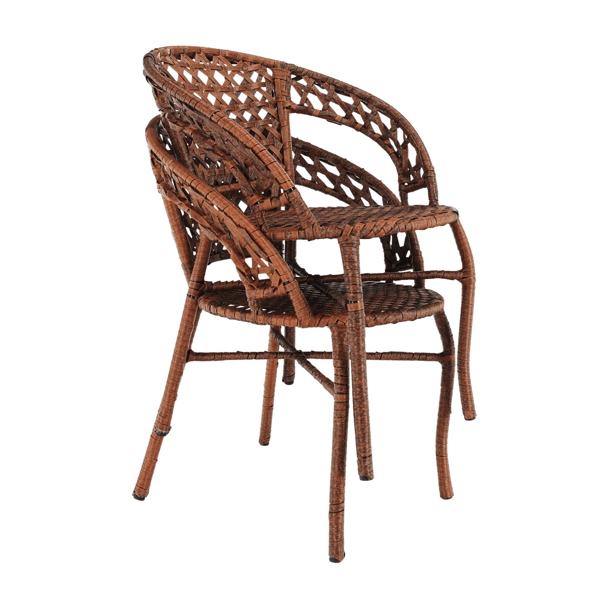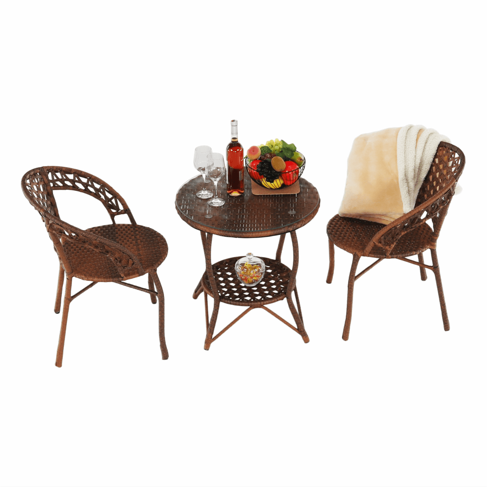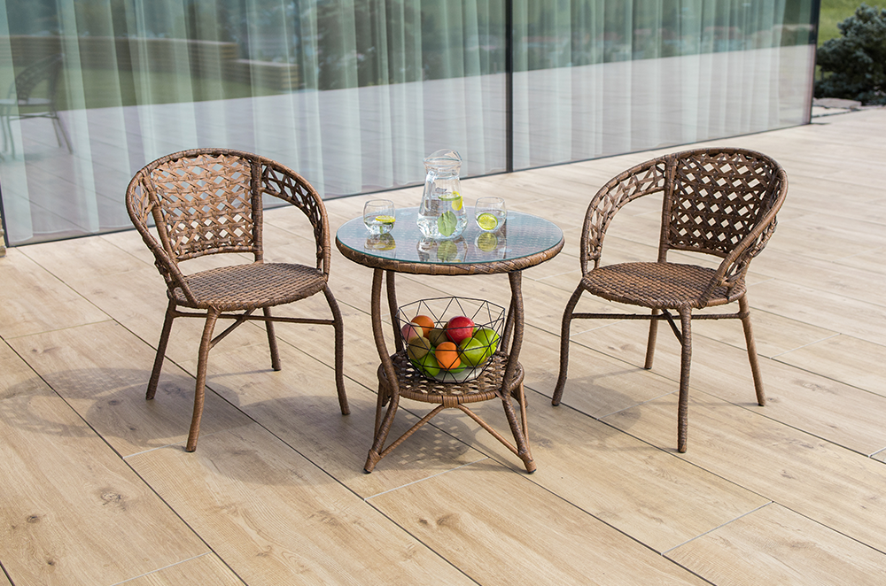 Tento elegantní a praktický set je ideální volbou pro každou terasu, balkon nebo menší zahradu. Kombinace umělého ratanu, ocelové konstrukce a skleněné desky stolu vytváří atraktivní vzhled i odolnost vůči venkovním podmínkám. Díky stohovatelným židlím šetří místo při skladování.Židle poskytují pohodlné sezení díky zaoblenému tvaru opěrky a příjemné výšce sedu. Kulatý stolek s tvrzeným sklem je dostatečně prostorný pro občerstvení, kávu nebo dekorace. Sestava nevyžaduje složité sestavování a je dodávána v demontu.Hlavní výhody produktu: odolná konstrukce z oceli a umělého ratanu skleněná deska stolu z tvrzeného skla stohovatelné židle pro snadné uskladnění ideální na balkon i menší zahradyParametry a specifikace: materiál: umělý ratan / ocel / tvrzené sklo barva: hnědá rozměry stolu (průměr x výška): 60 x 60 cm rozměry židle (Š x H x V): 58 x 59 x 74 cm hloubka sedu: 45,5 cm výška sedu: 41 cm nosnost židle: 90 kg obsah balení: 1x stůl, 2x židle židle jsou stohovatelné dodáváno v demontu
