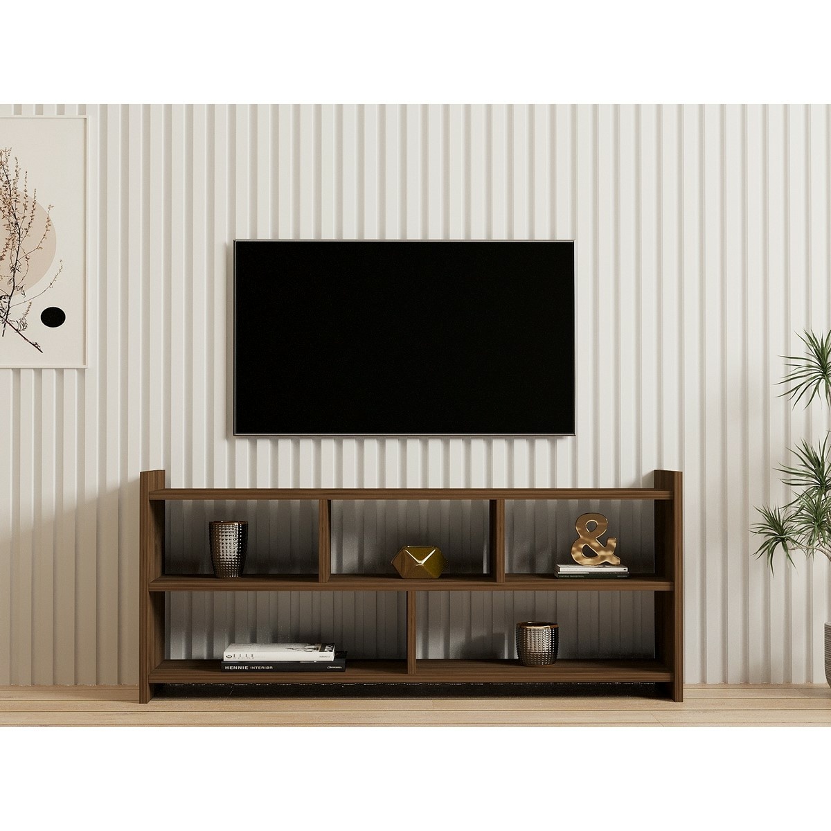 Televizní stolek Pera Walnut zaujme čistým skandinávským designem a elegantním ořechovým dekorem, který do interiéru vnáší teplo a nadčasový vzhled. Díky jednoduchým liniím působí lehce a snadno se kombinuje s moderním i klasickým vybavením obývacího pokoje.Stolek je vyroben ze 100% melaminem potažené dřevotřísky o tloušťce 18 mm, která zajišťuje pevnost a dlouhou životnost. Otevřený úložný prostor je praktický pro umístění TV techniky, doplňků nebo dekorací a pomáhá udržet zábavní zónu přehlednou a uspořádanou.Parametry a specifikace: materiál: 100% melaminem potažená dřevotříska tloušťka desky: 18 mm rozměry: šířka 117,5 cm, výška 55 cm, hloubka 28 cm barva: ořech