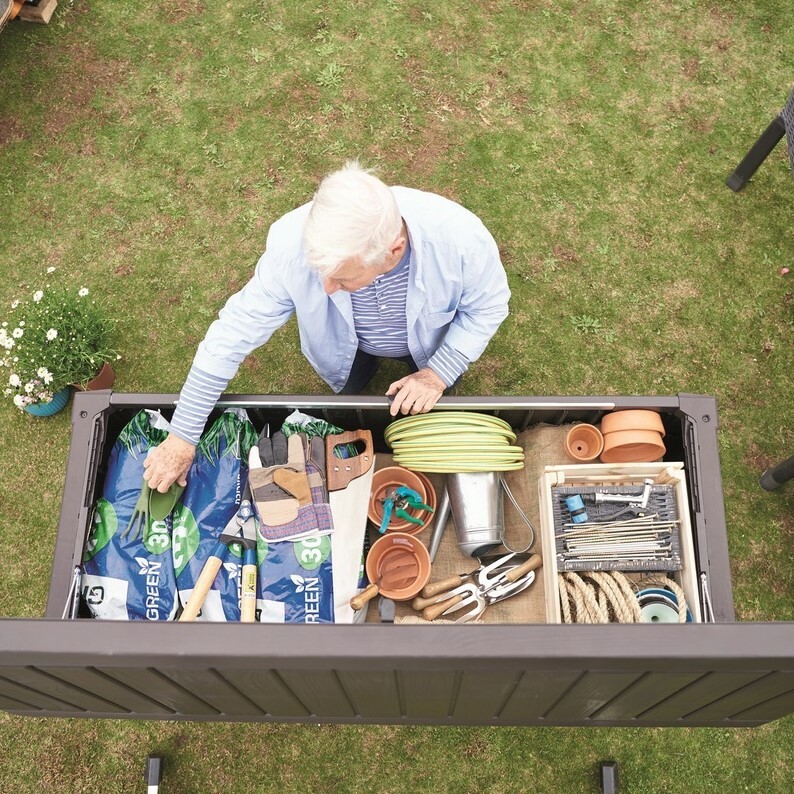 Úložný box ROCKWOOD je elegantním a praktickým řešením pro přehledné uložení vybavení na zahradě, terase nebo balkoně. V hnědém provedení s jemnou strukturou imitující dřevo působí přirozeně a vzdušně, takže se snadno sladí s různými typy venkovního nábytku i okolním prostředím. Díky čistým liniím nepůsobí robustně, přesto nabízí velmi štědrý úložný prostor.Hlavní předností boxu je velký objem, který poskytuje dostatek místa pro zahradní polštáře, deky, přikrývky i nezbytné zahradní nářadí. Vše je uloženo přehledně a chráněno před nečistotami a vlhkostí. Box je vyroben z odolného plastového materiálu, který je určen pro venkovní použití a nevyžaduje náročnou údržbu. Povrch si dlouhodobě zachovává svůj vzhled i při pravidelném vystavení povětrnostním vlivům.Další praktickou výhodou je mechanismus usnadňující otevírání víka, který zajišťuje pohodlnou manipulaci s obsahem. Díky robustní konstrukci může úložný box sloužit také jako sedadlo pro 2 osoby, což z něj dělá multifunkční doplněk vhodný i do menších venkovních prostor. Jednoduchá montáž bez složitých postupů umožňuje rychlé uvedení do provozu a okamžité používání.Hlavní výhody produktu: velký úložný objem pro textilie i zahradní nářadí tmavý design s realistickou imitací dřeva mechanismus pro snadné otevírání víka možnost využití jako sedadlo pro 2 osoby jednoduchá a rychlá montáž vhodné pro zahradu, terasu i balkonObsah balení: 1x úložný box ROCKWOODParametry a specifikace: materiál: plast povrch: imitace dřeva barva: hnědá otevírání: horní víko s podpůrným mechanismem funkce: úložný box a sedadlo nosnost: vhodné k sezení pro 2 osoby umístění: exteriér montáž: snadná montáž bez speciálního nářadí