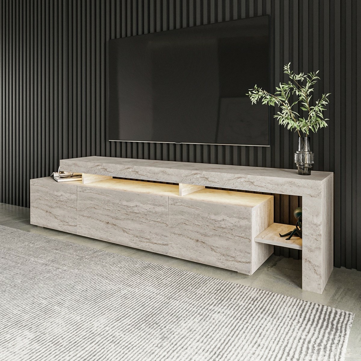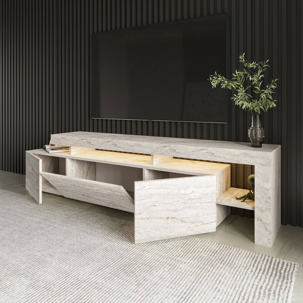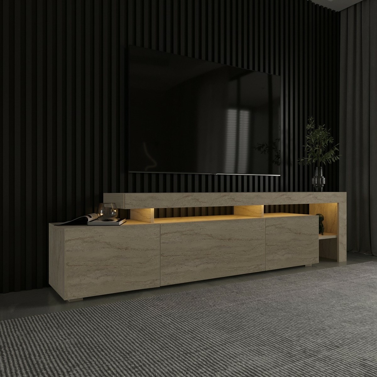 Televizní stolek Beliz Travertine přináší moderní vzhled s elegantním dekorem travertine, který dodá obývacímu pokoji jemný a sofistikovaný charakter. Světlé provedení působí vzdušně a snadno se kombinuje s moderním i minimalistickým interiérem.Korpus z 100% melaminem potažené dřevotřísky o tloušťce 18 mm zajišťuje pevnost a dlouhou životnost. PVC lemování hran chrání povrch před opotřebením a integrované LED osvětlení podtrhuje moderní design a vytváří příjemnou atmosféru. Více polic nabízí praktický úložný prostor pro elektroniku i doplňky.Parametry a specifikace: materiál: 100% melaminem potažená dřevotříska tloušťka desky: 18 mm lemování hran: PVC osvětlení: LED rozměry stolku: 192 × 53 × 37 cm rozměry TV police: 162 × 53 × 35 cm dekor: travertine