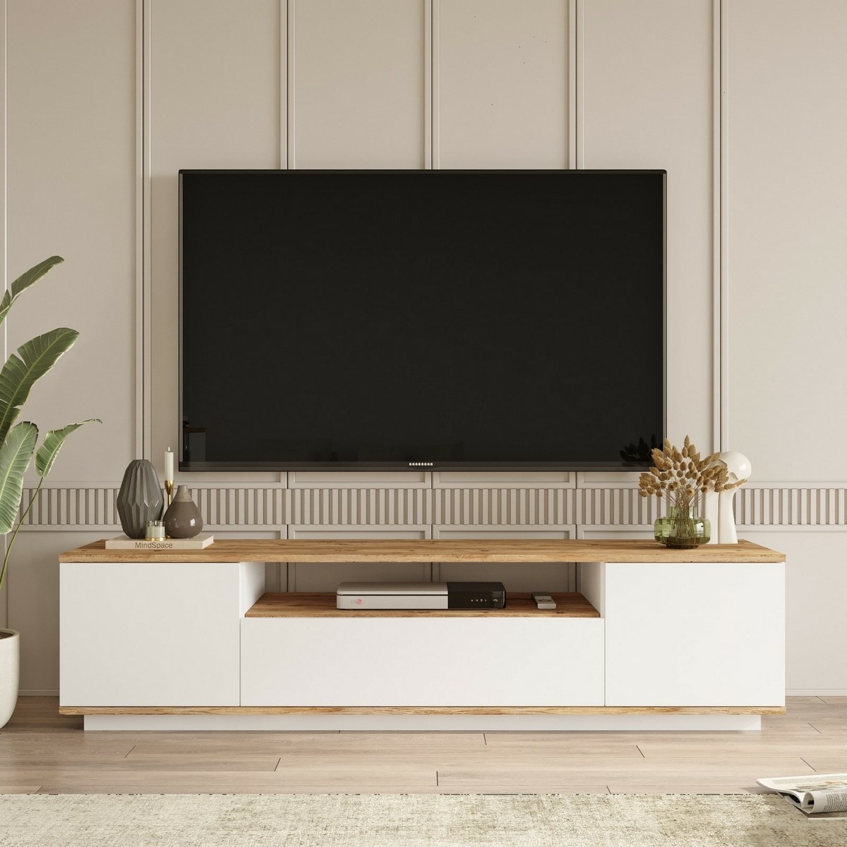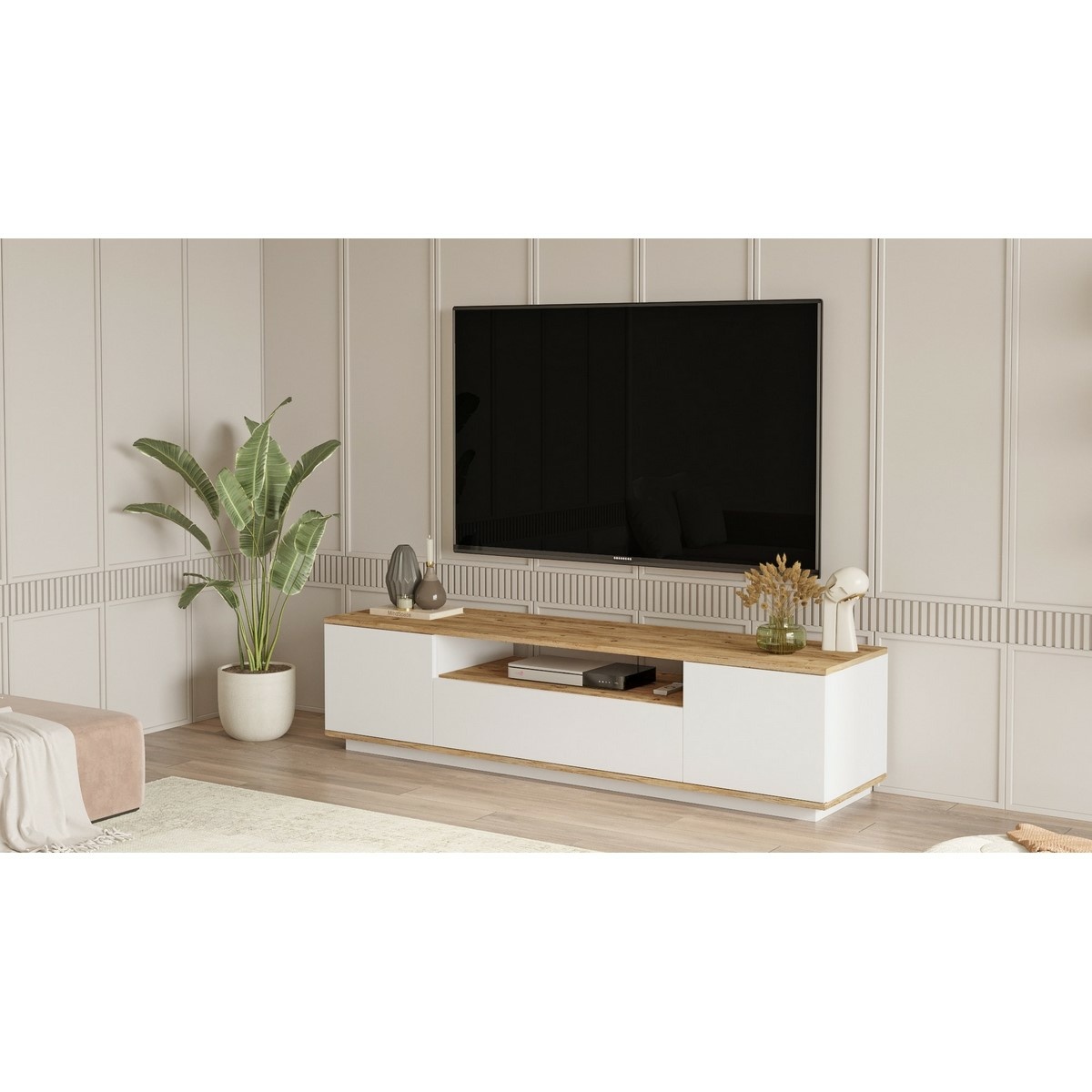 Televizní stolek Fran Atlantic Pine and White nabízí jednoduchý moderní design v kombinaci dekoru borovice atlantic a bílé barvy, která působí svěže a nadčasově. Hodí se do světlých i kontrastních interiérů a snadno se kombinuje s dalším nábytkem.Je vyroben ze 100% melaminem potažené dřevotřísky o tloušťce 18 mm, která zajišťuje stabilitu a dlouhou životnost. Otevřené úložné prostory poskytují praktické místo pro elektroniku i drobnosti a pomáhají udržet obývací pokoj přehledný.Technické údaje: materiál: 100% melaminem potažená dřevotříska tloušťka: 18 mm rozměry: 180 × 44,6 × 44,5 cm barva: borovice atlantic / bílá