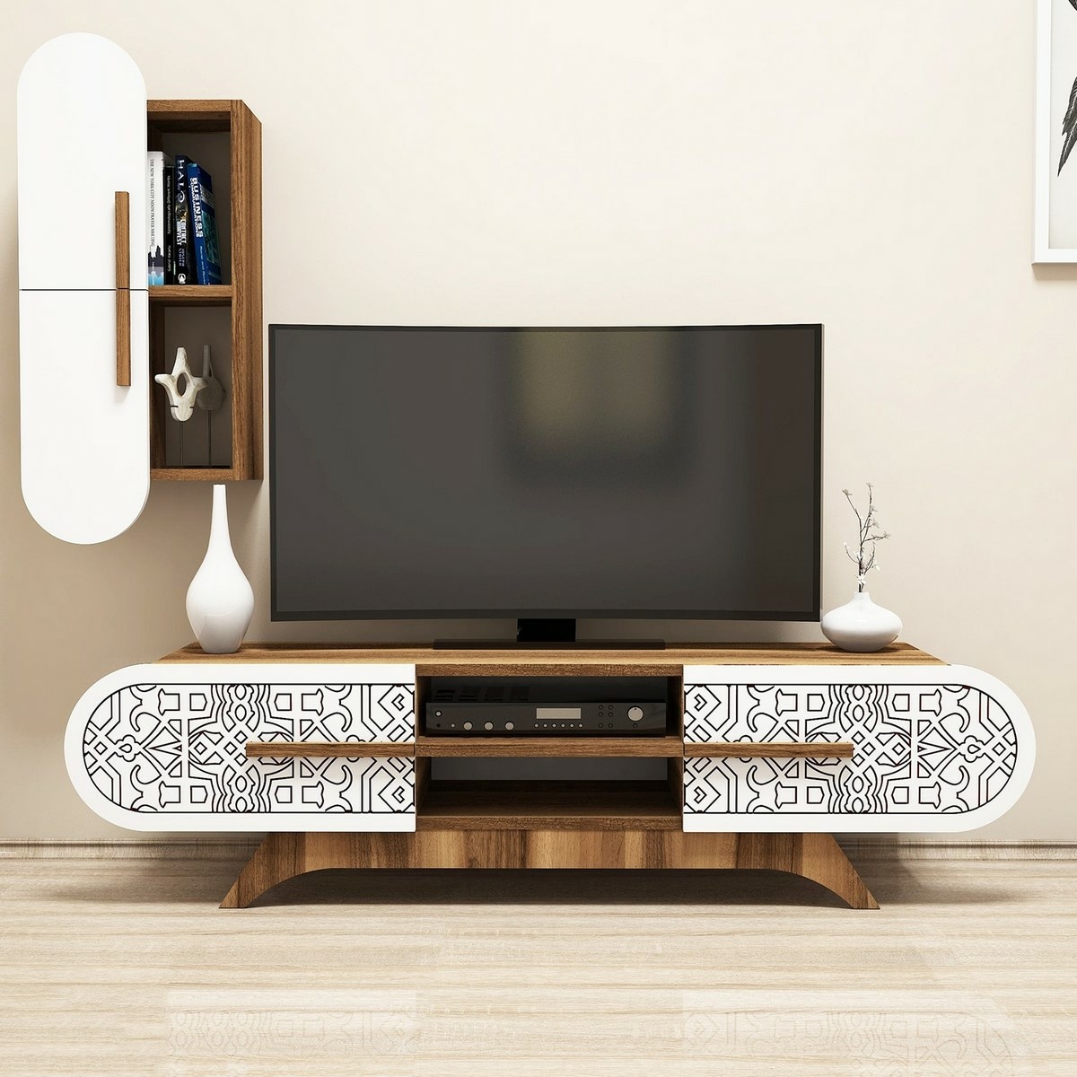 Televizní stolek se skříňkou Defne White and Walnut kombinuje moderní design s jemným nádechem klasiky. Spojení bílé barvy a ořechového dekoru působí elegantně, hřejivě a snadno zapadne do současných i nadčasových interiérů. Oblé linie a promyšlené detaily z něj dělají výrazný, ale stále vyvážený prvek obývacího pokoje.Sestava nabízí praktický úložný prostor v podobě televizního stolku a nástěnné skříňky, které umožňují přehledné uložení elektroniky, médií i dekorací. Otevřené police i uzavřená část pomáhají udržet zábavní zónu uspořádanou a vizuálně čistou.Korpus je vyroben ze 100% melaminem potažené dřevotřísky o tloušťce 18 mm, která zajišťuje pevnost a dlouhou životnost. Celek působí lehce, ale zároveň stabilně a funkčně.Parametry a specifikace: materiál: 100% melaminem potažená dřevotříska tloušťka desky: 18 mm rozměry TV stolku: 145 × 37 × 35 cm rozměry nástěnné skříňky: 35 × 60 × 20 cm výška dvířek skříňky: 80 cm barva: bílá / ořech