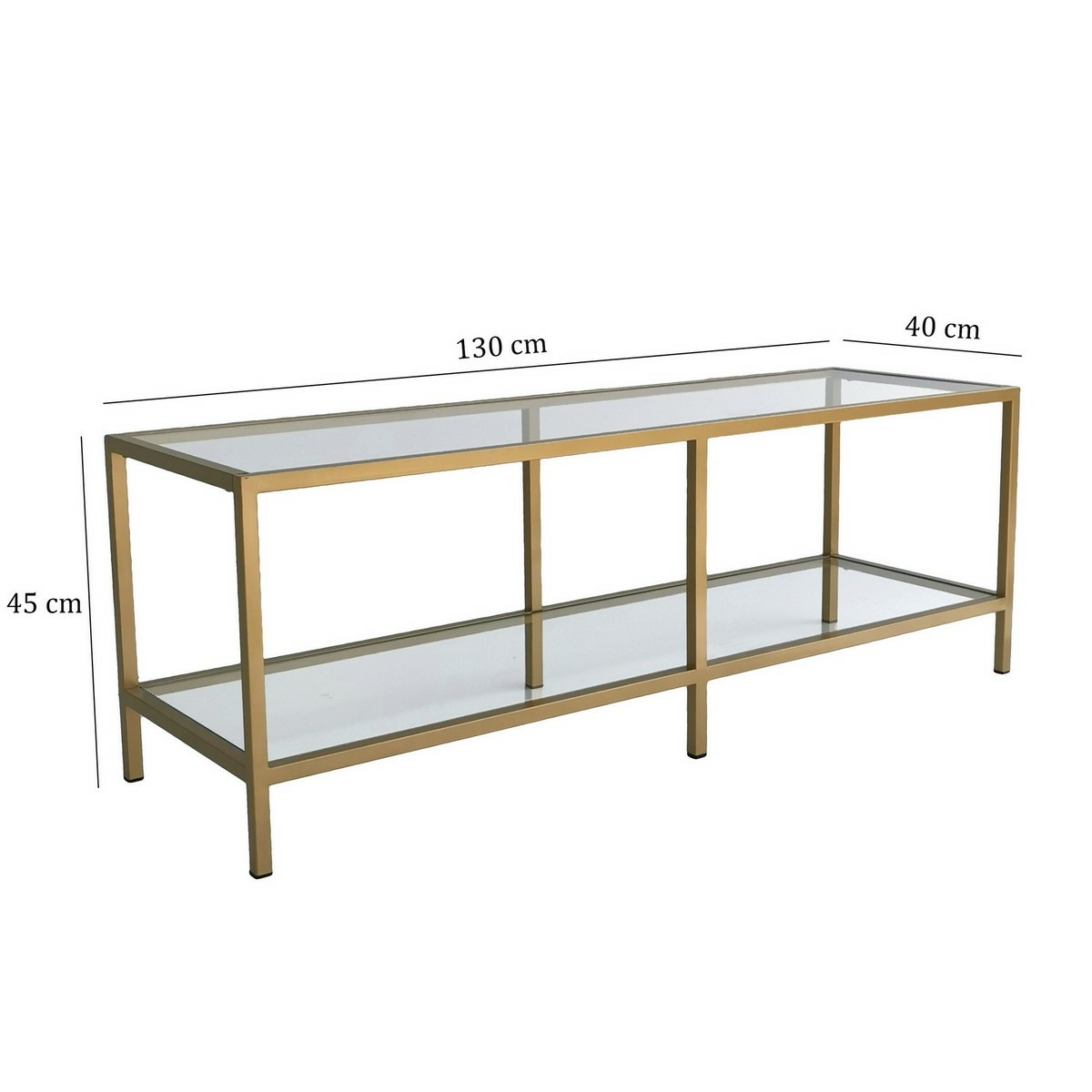 Televizní stolek Basic Gold zaujme luxusním glam designem, který kombinuje elegantní tvrzené sklo a subtilní kovovou konstrukci ve zlaté barvě. Působí lehce, vzdušně a zároveň se stává výrazným designovým prvkem moderního obývacího pokoje.Konstrukce z 100% tvrzeného skla o tloušťce 4 mm dodává stolku sofistikovaný vzhled, zatímco kovový rám zajišťuje stabilitu a dlouhou životnost. Otevřené police poskytují praktický prostor pro elektroniku, herní konzole i stylové doplňky a pomáhají udržet zábavní zónu přehlednou.Zlaté provedení přináší do interiéru nádech elegance a luxusu a skvěle se kombinuje s moderním, minimalistickým i glamour stylem.¨Parametry a specifikace: materiál: 100% tvrzené sklo / kovový rám tloušťka skla: 4 mm šířka: 130 cm výška: 45 cm hloubka: 40 cm barva: zlatá