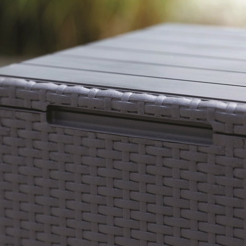 Úložný box Vigo je praktickým a elegantním doplňkem pro zahradu, terasu i balkon, kde pomůže udržet pořádek a mít vše potřebné po ruce. Ploché proutí v kombinaci s pevnou horní deskou z resolitu působí moderně a snadno se sladí s dalším zahradním nábytkem. Díky kompaktnímu tvaru jej lze umístit vedle pohovky nebo křesla a využít jako nenápadný úložný prostor.Box je vyroben z odolného plastu, který je navržen pro venkovní použití. Spolehlivě chrání uložené věci před nepříznivým počasím i UV zářením, takže obsah zůstává v bezpečí a box si zachovává svůj vzhled po dlouhou dobu. Údržba je velmi snadná a nevyžaduje žádnou zvláštní péči.Hlavní výhody produktu praktický úložný prostor pro venkovní použití moderní design s plochým proutím pevná horní deska z resolitu snadné kombinování s dalším nábytkem odolnost vůči povětrnostním vlivům a UV zářeníObsah balení 1x úložný boxParametry a specifikace typ: venkovní úložný box materiál: plast s proutěnou strukturou materiál horní desky: resolit použití: zahrada, terasa, balkon údržba: snadné čištění odolnost: povětrnostní vlivy a UV záření