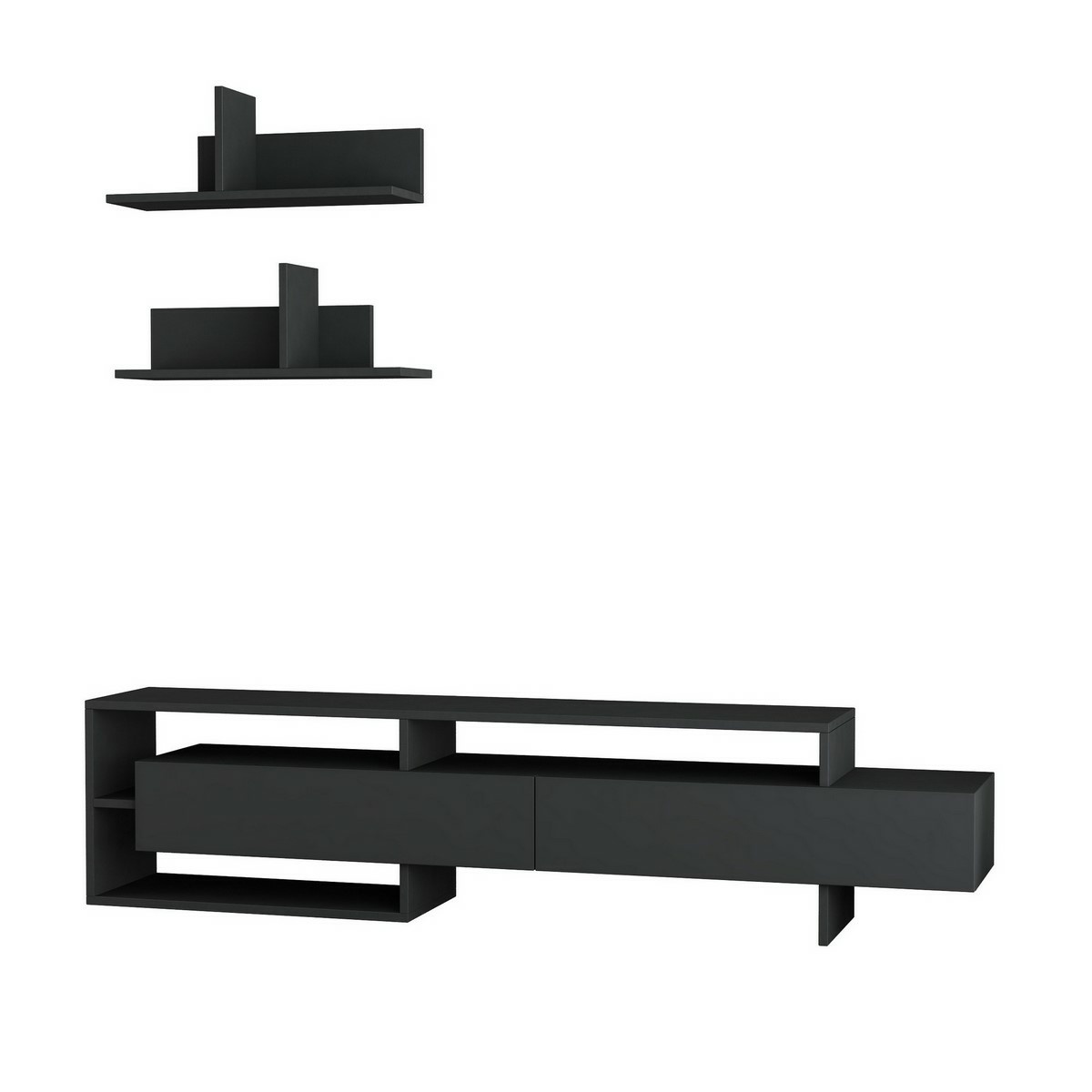 Televizní stolek s poličkami Gara Anthracite je moderní řešení pro obývací pokoj, kde se klade důraz na čistý vzhled a praktičnost. Jednobarevné antracitové provedení působí elegantně a snadno se kombinuje s ostatním nábytkem i doplňky.Stolek je vyroben ze 100% melaminem potažené dřevotřísky o tloušťce 18 mm, která zajišťuje pevnost a dlouhou životnost. Nabízí dostatek úložného prostoru v podobě polic a uzavřených částí, takže televizní technika, herní konzole i drobnosti zůstanou přehledně uspořádané. Součástí jsou také nástěnné police, které rozšiřují úložné i odkládací možnosti a podtrhují moderní charakter sestavy.Technické údaje: materiál: 100% melaminovaná dřevotříska tloušťka: 18 mm rozměry TV stolku: 180 × 42 × 32 cm rozměry nástěnné police: 65 × 20 × 20 cm barva: antracit
