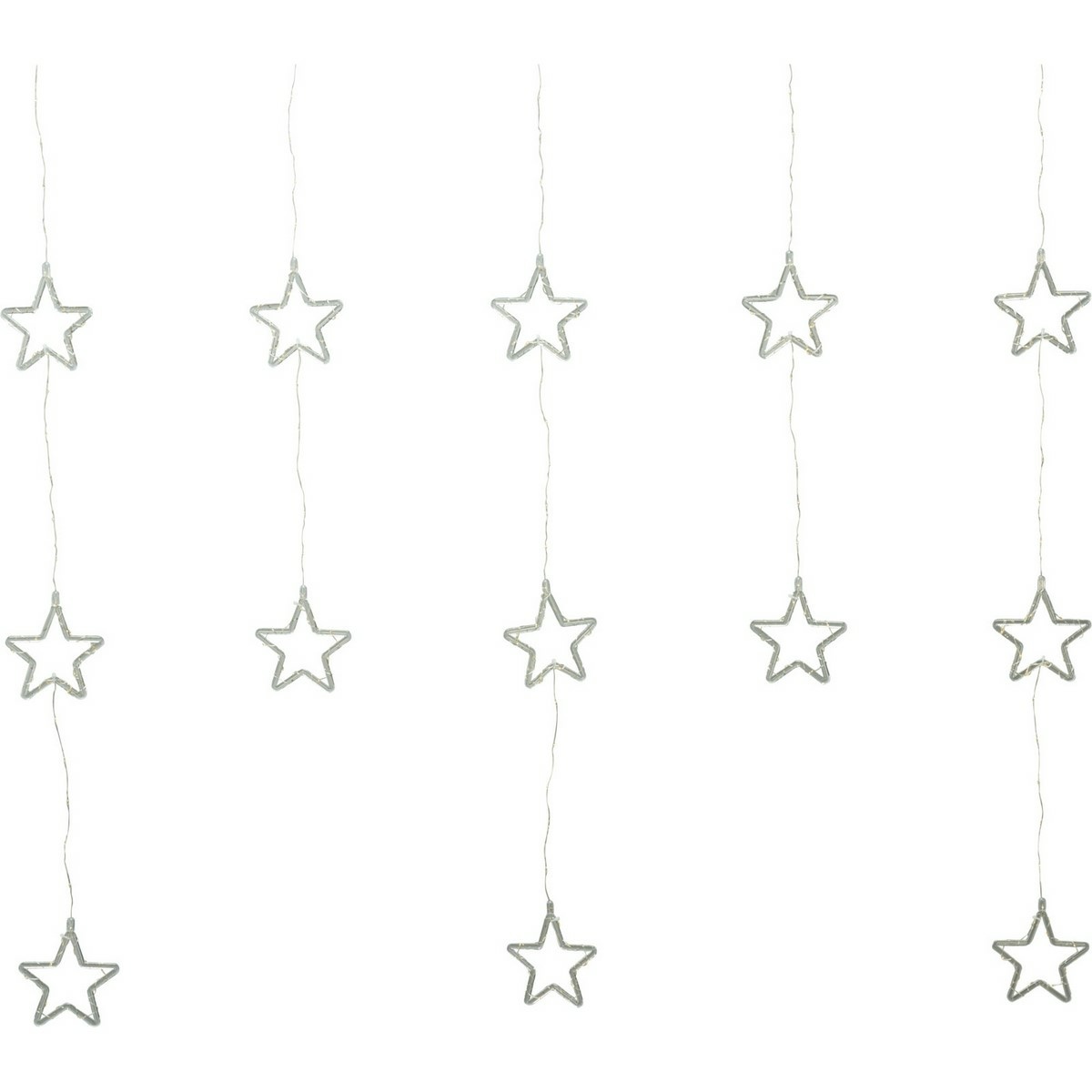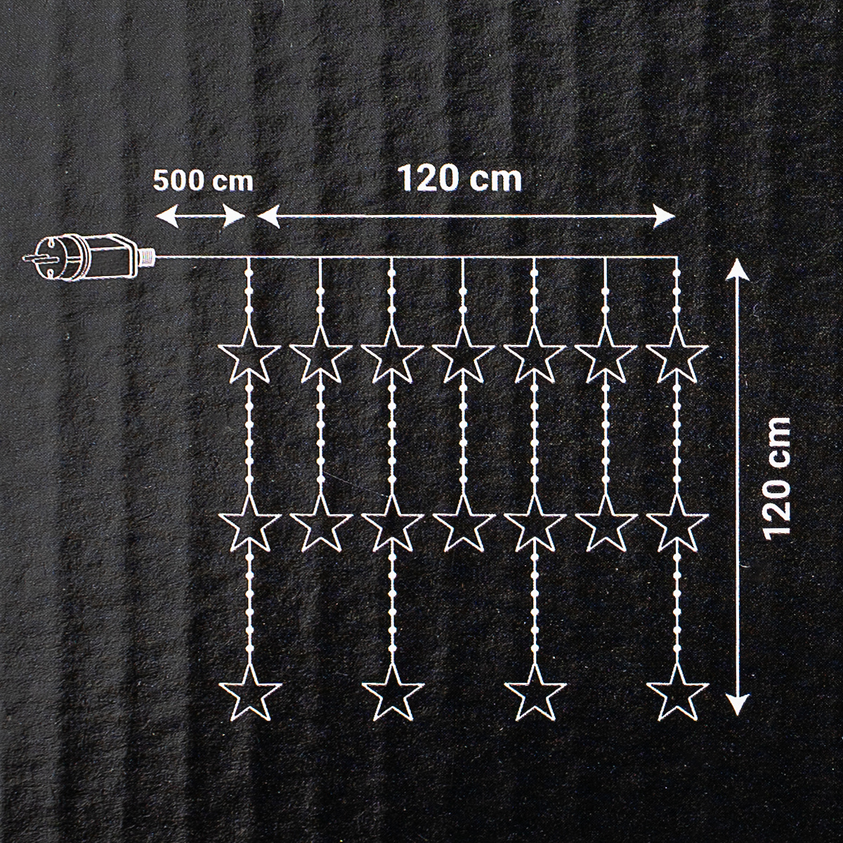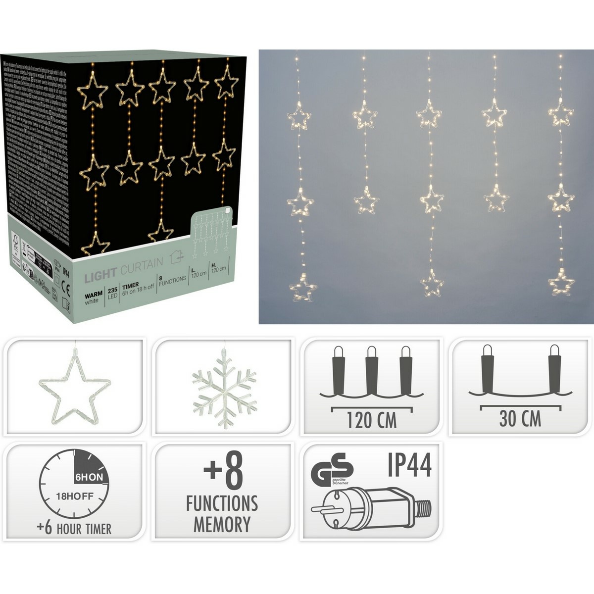 Světelný venkovní závěs s hvězdičkami rozzáří každý zimní večer. Krásná svítící venkovní i vnitřní dekorace pro dům i zahradu. Zavěsit jej můžete do okna, na zábradlí terasy, balkonů i na zahradní pergoly.Hlavní vlastnosti: Rozměr světelné části: 120 × 120 cm Počet LED: 235 micro LED Barva světla: teplá bílá Ochrana: IP44 – odolné proti vlhkosti a dešti Časovač: integrovaný 6/18 h (6 hodin svítí, 18 hodin pauza) 8 světelných funkcí – blikání, prolínání, stálé svícení aj. Délka přívodního kabelu: 5 m Vzdálenost mezi prameny: 30 cm Napájení: adaptér s časovačem (součástí balení) Balení: elegantní dárková krabice Rozměr balení: 130 × 115 × 160 mmVytvořte doma pohádkovou atmosféru a nechte své okolí zazářit.