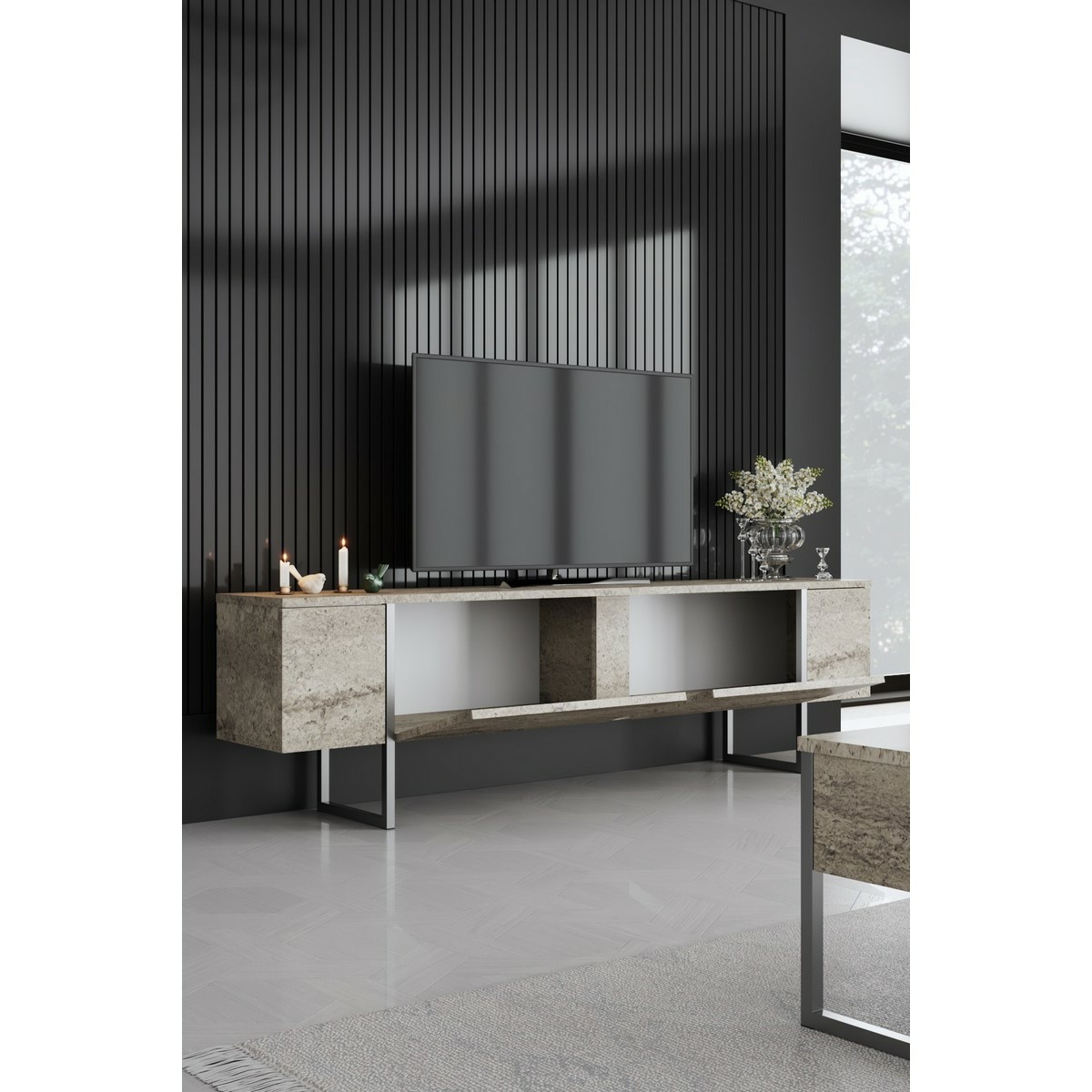 Televizní stolek Luxe Travertine and Silver je moderní a elegantní doplněk do obývacího pokoje, který zaujme sofistikovanou kombinací travertinového dekoru a stříbrných akcentů. Kontrast přírodního vzhledu a kovových detailů působí současně a nadčasově, takže se stolek snadno začlení do moderních i designově laděných interiérů.Stolek je vyroben ze 100% melaminem potažené dřevotřískové desky o tloušťce 18 mm, která zajišťuje pevnost, stabilitu a dlouhou životnost. Kovové nohy dodávají nábytku lehkost a spolehlivou oporu, zatímco praktický systém vedení kabelů pomáhá udržet zábavní zónu přehlednou a bez rušivých kabelů.Parametry a specifikace: materiál: 100% melaminem potažená dřevotřísková deska tloušťka: 18 mm nohy: kovové rozměry: 180 × 50 × 30 cm barva: travertin / stříbrná
