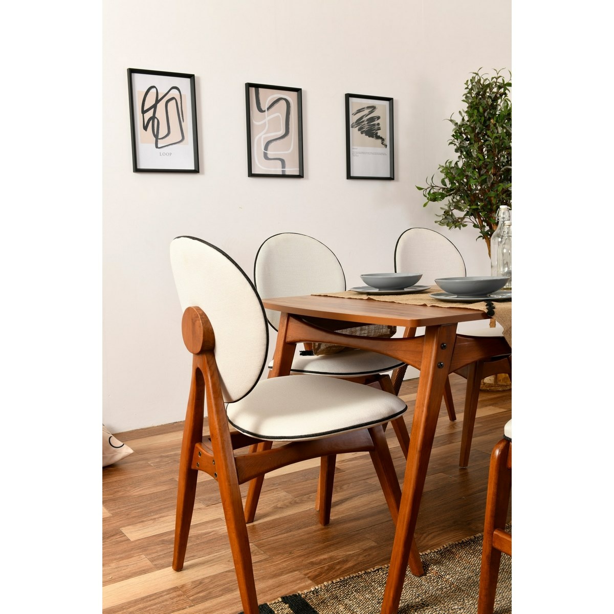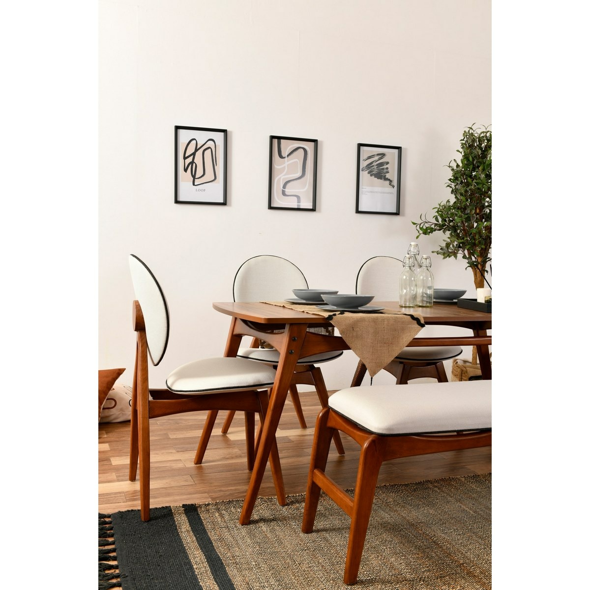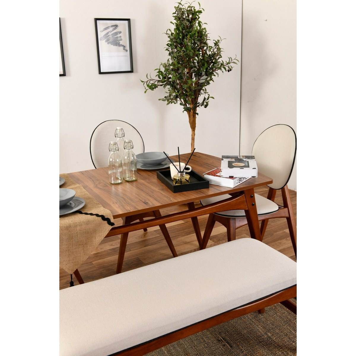 Jídelní set Touch Walnut and Cream vytváří útulný a harmonický jídelní prostor díky kombinaci přírodního ořechového odstínu a krémového čalounění. Celek působí teple, elegantně a je vhodný jak pro rodinné stolování, tak pro společná setkání s přáteli. Spojení stolu, lavice a židlí nabízí praktické a vizuálně vyvážené řešení jídelny.Konstrukce z 100% habrového dřeva zajišťuje pevnost, stabilitu a dlouhou životnost. Židle jsou čalouněny lněnou látkou, lavice je potažena nubukovou látkou, což přispívá k pohodlí při sezení i celkově elegantnímu vzhledu setu.Parametry a specifikace: typ produktu: jídelní set (6dílný) materiál konstrukce: 100% habrové dřevo tloušťka materiálu: 18 mm rozměry stolu: 78 × 160 × 75 cm (š × d × v) rozměry lavice: 120 × 40 × 45 cm (š × h × v) rozměry židle: 54 × 44 × 90 cm (š × h × v) čalounění židlí: lněná látka čalounění lavice: nubuková látka barva: ořech a krémová