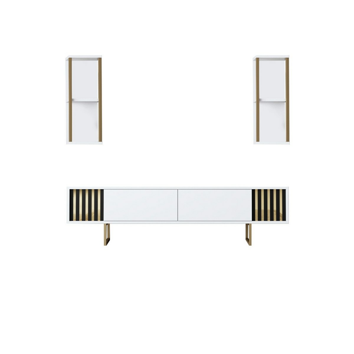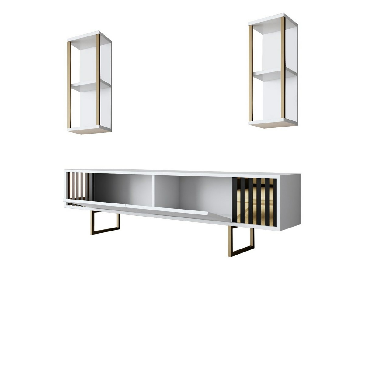 Televizní stolek s policemi Linie White and Gold vyniká čistým moderním designem a elegantní kombinací bílé barvy se zlatými detaily. Díky jednoduchým liniím a kovovým nohám působí lehce a stylově a snadno zapadne do moderně laděných interiérů.Korpus je vyroben ze 100% melaminem potažené dřevotřísky o tloušťce 18 mm, která zajišťuje stabilitu a dlouhou životnost. Prostorná horní deska nabízí dostatek místa pro televizi a elektroniku, zatímco dvě nástěnné police poslouží k uložení dekorací, knih nebo drobných doplňků.Technické detaily: materiál: 100% melaminovaná dřevotříska tloušťka: 18 mm nohy: kovové, výška 18 cm rozměry stolku: 180 × 48 × 30 cm nástěnné police: 2 ks, 22 × 60 × 21 cm barva: bílá a zlatá