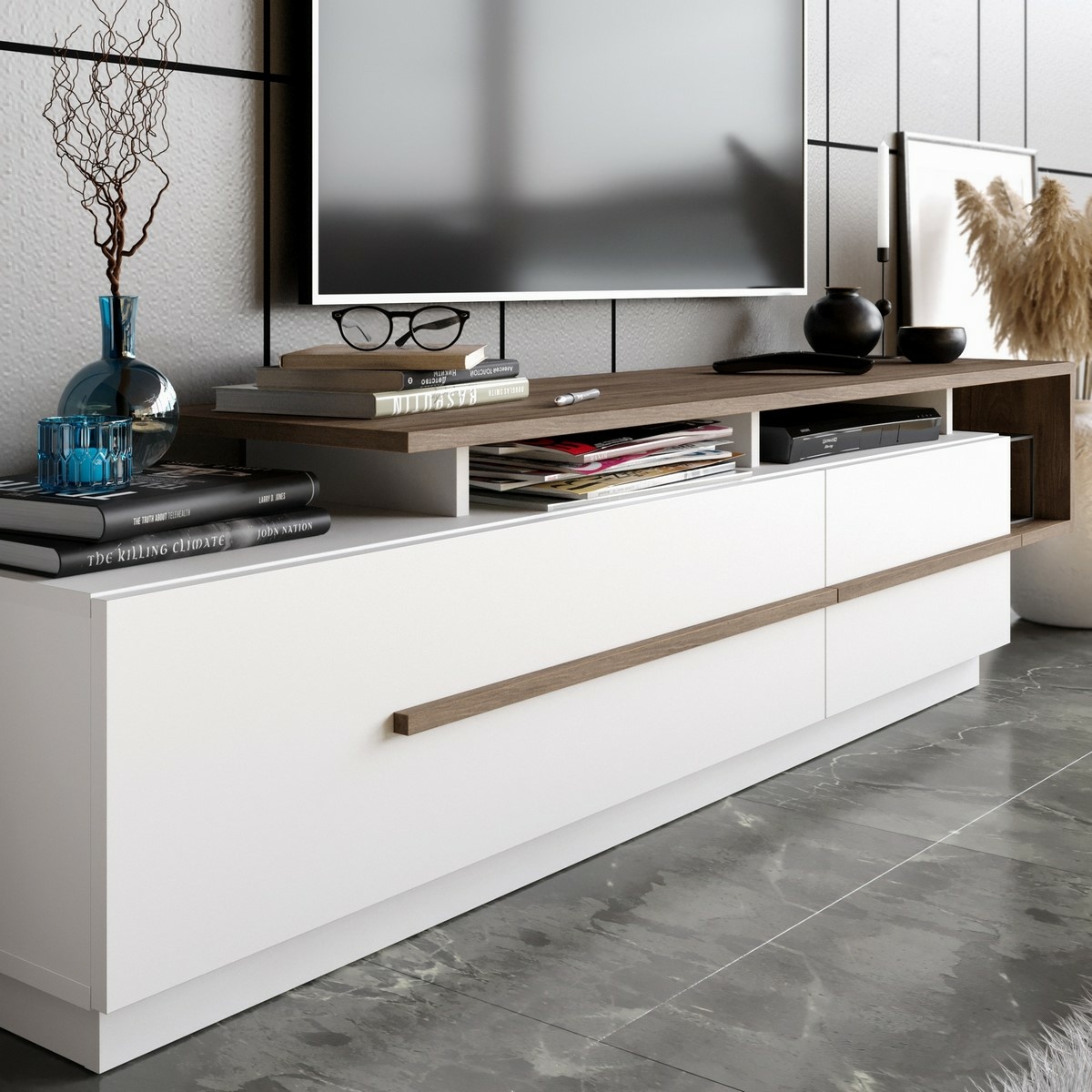 Televizní stolek Pia White and Walnut zaujme moderním a elegantním designem, který kombinuje bílé provedení s teplým ořechovým dekorem. Tato nadčasová barevná kombinace působí lehce a harmonicky a snadno zapadne do moderních i skandinávsky laděných interiérů.Stolek je vyroben ze 100% melaminem potažené dřevotřísky o tloušťce 18 mm, která zajišťuje pevnost a dlouhou životnost. Nabízí praktický úložný prostor pro TV techniku i doplňky a díky možnosti upevnění na stěnu zvyšuje bezpečnost i flexibilitu umístění. Horní plocha o šířce 150 cm poskytuje dostatek místa pro dekorace nebo elektroniku.Parametry a specifikace: materiál: 100% melaminem potažená dřevotříska tloušťka desky: 18 mm rozměry: šířka 180 cm, výška 46,4 cm, hloubka 38,9 cm šířka horní plochy: 150 cm barva: bílá / ořech