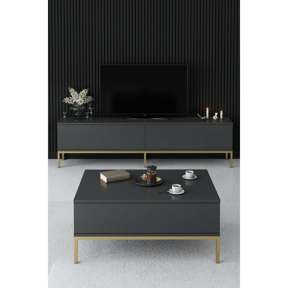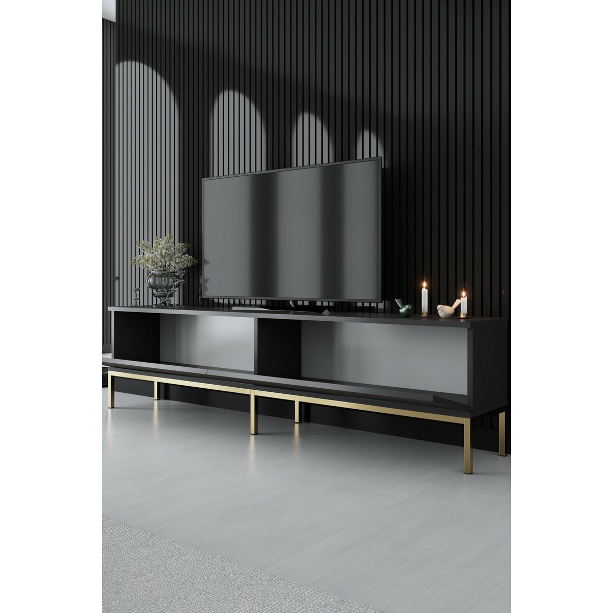 Televizní stolek Lord Anthracite and Gold je moderní a elegantní řešení pro obývací pokoj, které zaujme sofistikovanou kombinací antracitové barvy a zlatých akcentů. Čisté linie a kontrastní provedení dodávají interiéru luxusní, současný vzhled a snadno zapadnou do moderních i designově výrazných prostor.Stolek je vyroben ze 100% melaminem potažené dřevotřískové desky o tloušťce 18 mm, která zajišťuje pevnost a dlouhou životnost. Kovové nohy poskytují stabilní oporu a podtrhují elegantní charakter nábytku. Úložný prostor umožňuje přehledné uspořádání elektroniky a příslušenství, takže zábavní zóna zůstane čistá a organizovaná.Parametry a specifikace: materiál: 100% melaminem potažená dřevotřísková deska tloušťka: 18 mm nohy: kovové rozměry: 180 × 47 × 30 cm barva: antracitová / zlatá