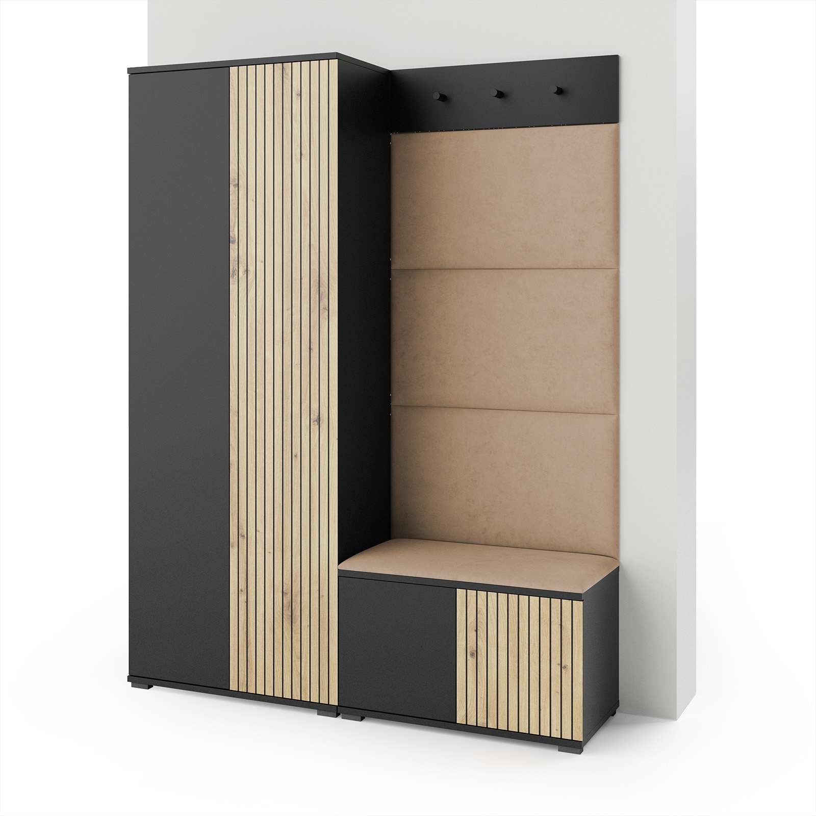 Eka Předsíňová stěna s čalouněnými panely Joey 1 - Černá a Dub Artisan / Béžová 2304
