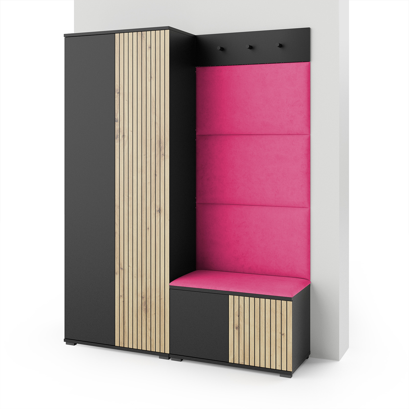 Eka Předsíňová stěna s čalouněnými panely Joey 1 - Černá a Dub Artisan / Růžová 2310