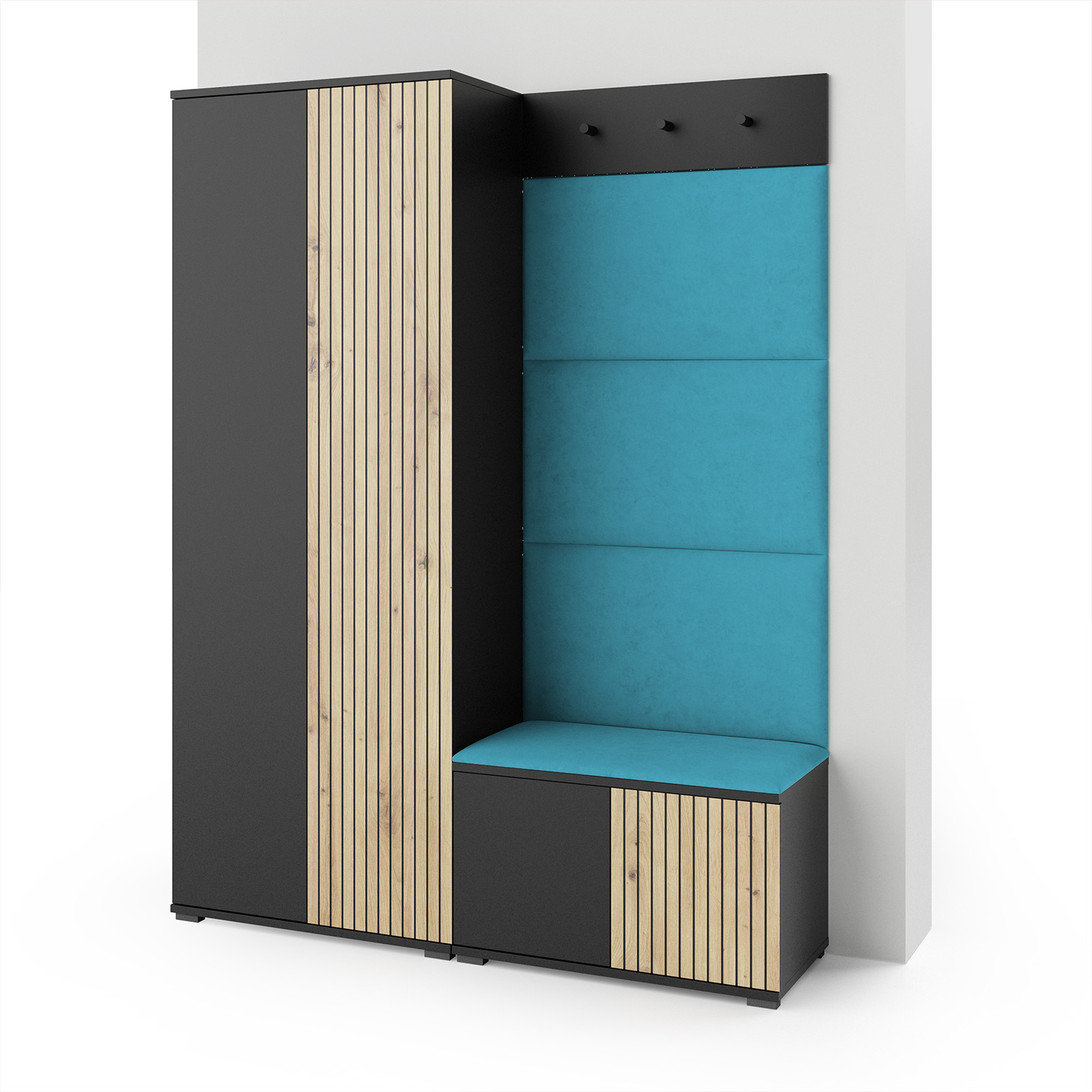 Eka Předsíňová stěna s čalouněnými panely Joey 1 - Černá a Dub Artisan / Azurová 2313