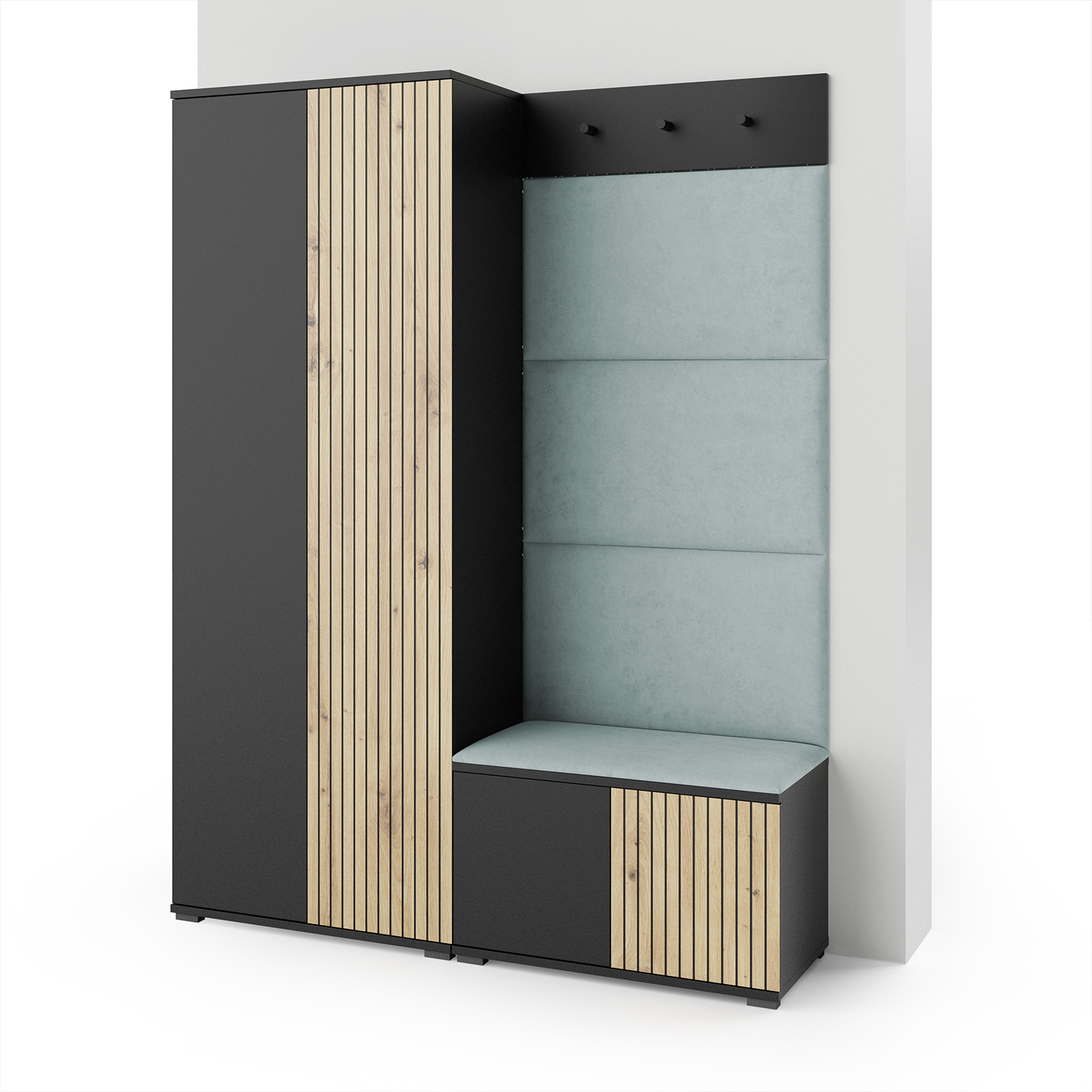 Eka Předsíňová stěna s čalouněnými panely Joey 1 - Černá a Dub Artisan / Světlá zelená 2321