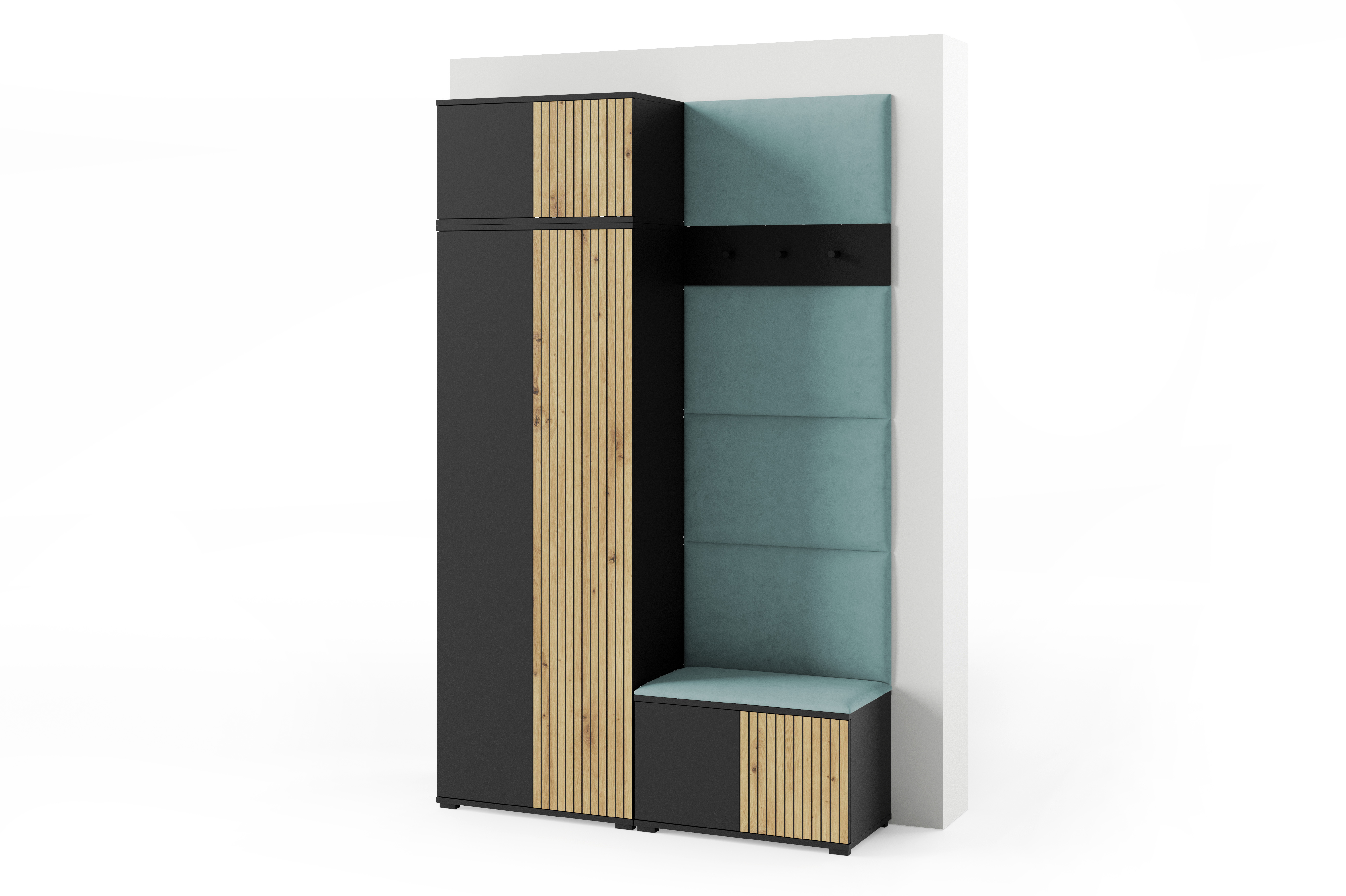 Eka Předsíňová stěna s čalouněnými panely Joey 2 - Černá a Dub Artisan / Světlá modrá 2322