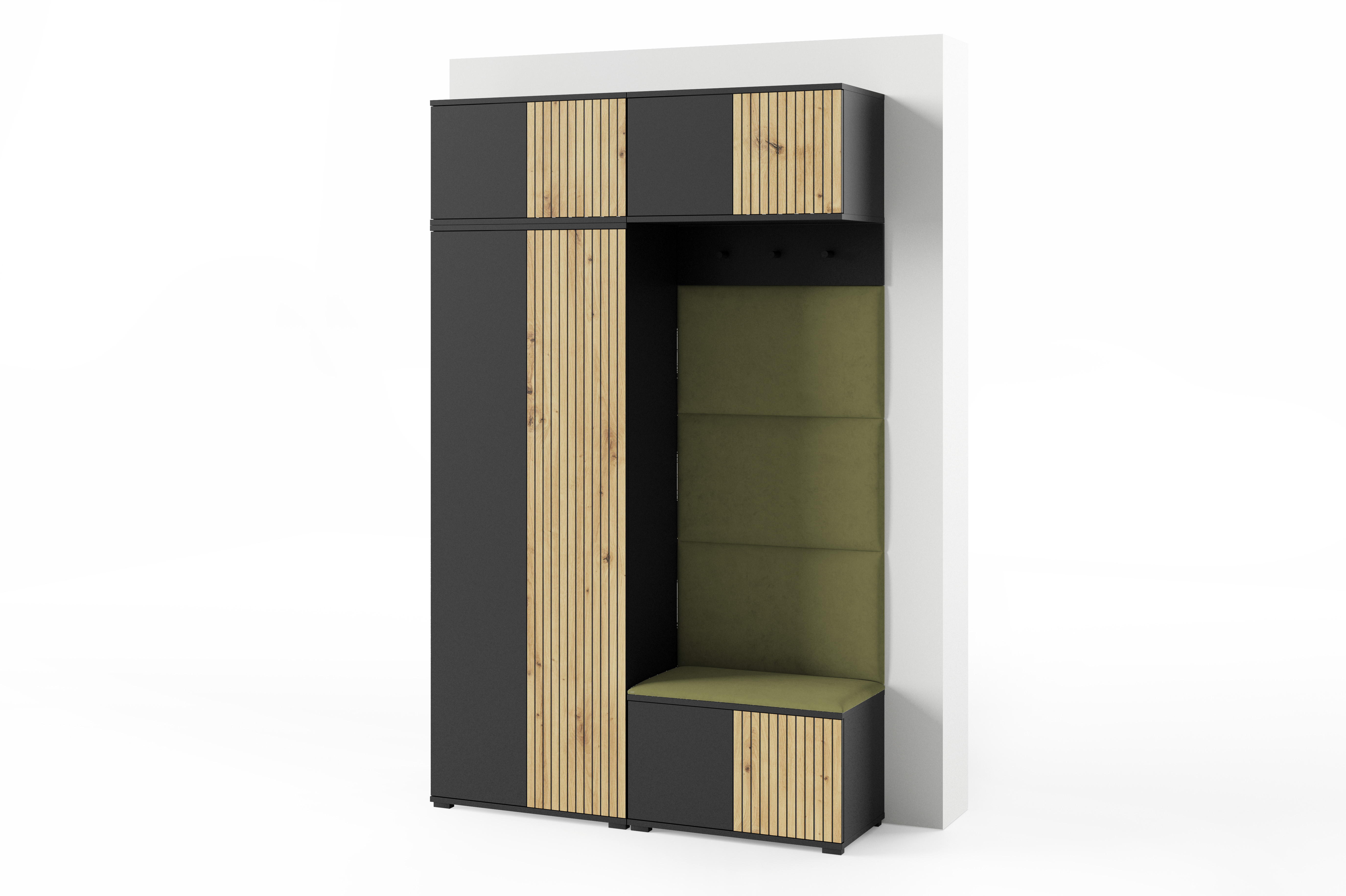 Eka Předsíňová stěna s čalouněnými panely Joey 3 - Černá a Dub Artisan / Khaki zelená 2327