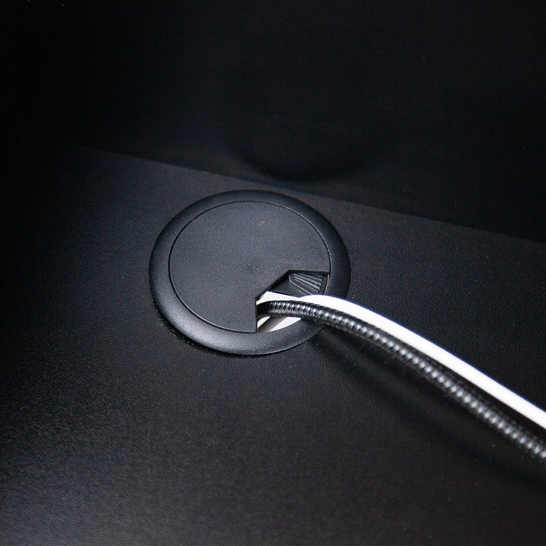 Dodatečné vlastnosti: Bytelná kovová konstrukce, výřez v desce pro lepší zasunutí ke stolu a větší pohodlí pro lokty, dvě kabelové průchodky pro vedení kabelů.