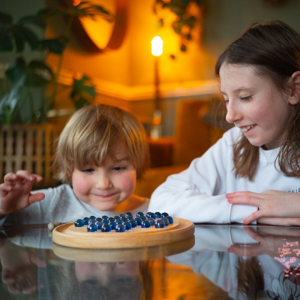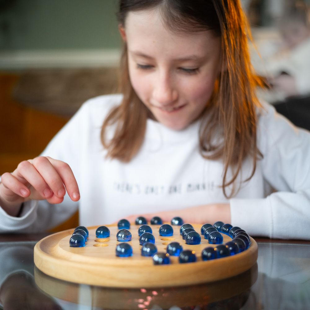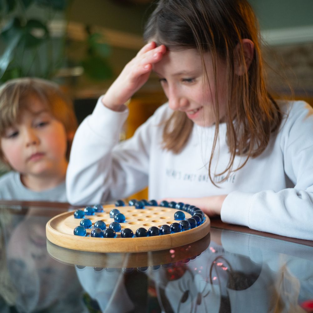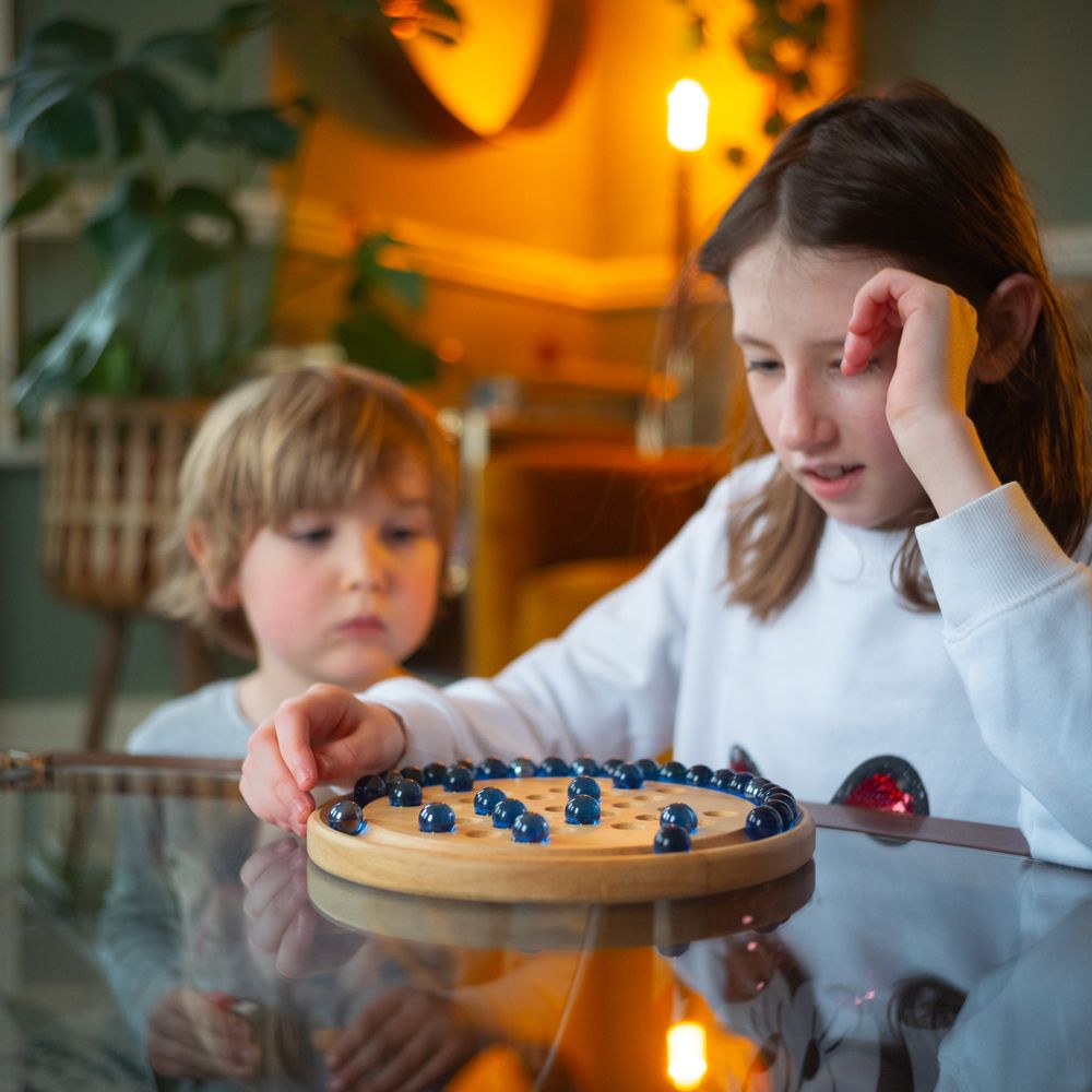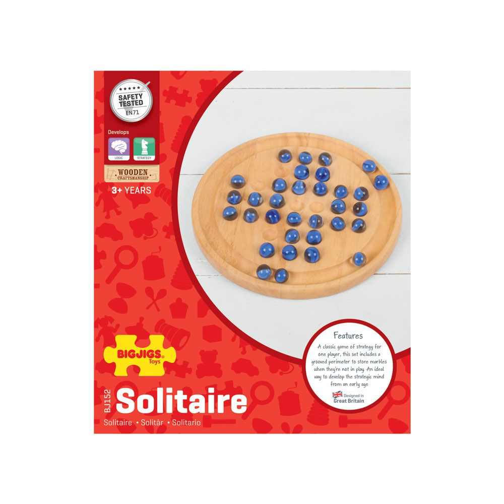 Tato dřevěná sada solitaire obsahuje lesklé kuličky na kruhové, dřevěné desce. S historií trvající stovky let je Solitaire klasickou dřevěnou deskovou hrou, která se nachází v mnoha rodinách. Ideální způsob, jak rozvíjet strategickou mysl od raného věku.