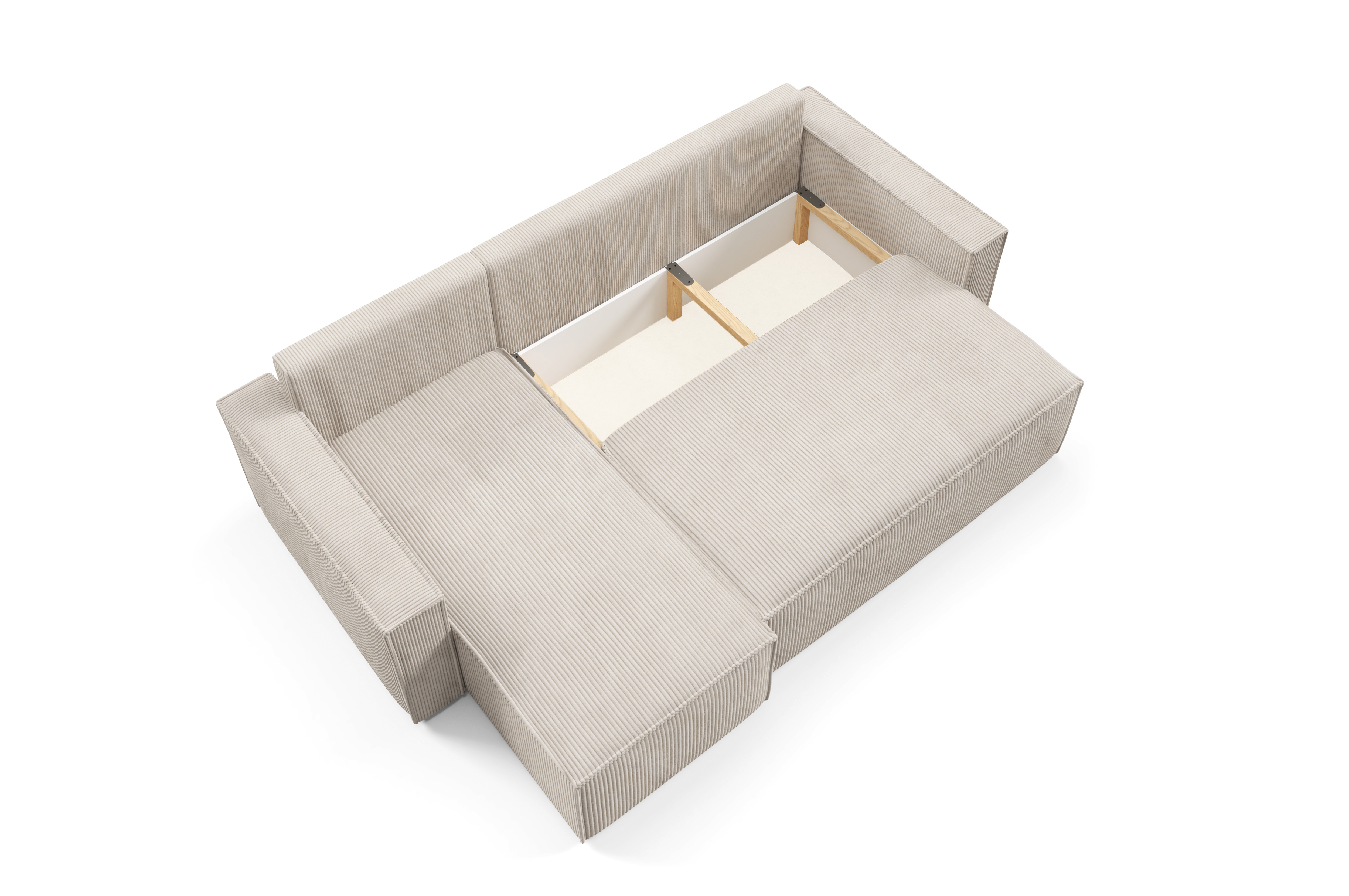 Praktický box schovaný uvnitř – na deky, polštáře i všechny drobnosti, co nechceš mít na očích.