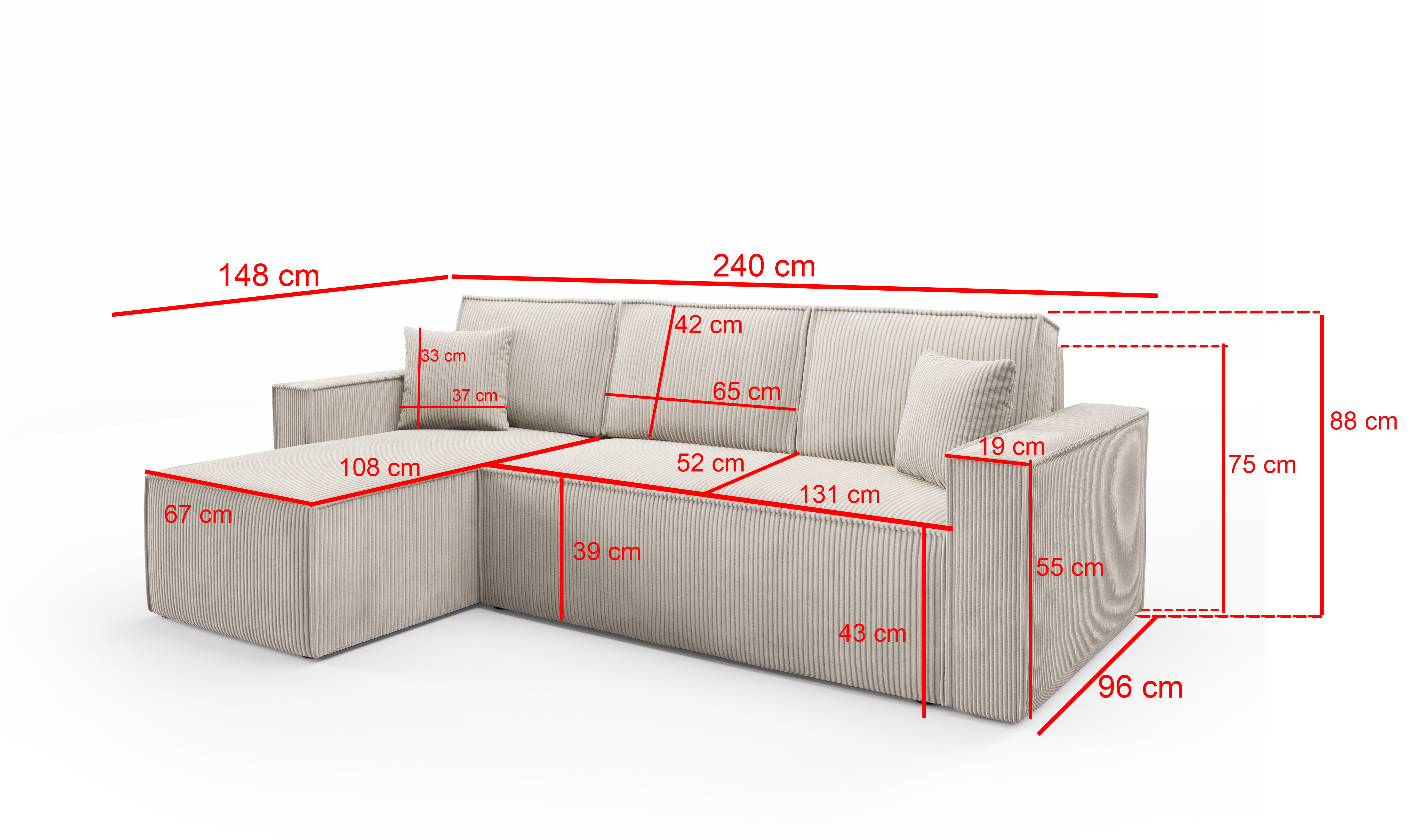 Rohová sedací souprava BASIC L je spolehlivým parťákem do každého obýváku. Nabízí pohodlné sezení pro rodinu i návštěvy – a když se večer protáhne, snadno ji rozložíš na prostorné lůžko. Uvnitř se skrývá praktický úložný prostor, kam se vejdou deky, peřiny nebo třeba tvoje oblíbené dobroty. Potahy jsou ušité z tkanin s certifikací OEKO-TEX®, takže si můžeš být jistý, že jsou šetrné k tobě i k přírodě. A aby ladila i s tvým vkusem? Vyber si barvu látky – sedačku nabízíme v několika elegantních variantách. ️ Rohové pohodlí ve tvaru L ️ Rozkládací lůžko Úložný prostor Výběr látky Pohodlí na každý den ✨ Elegantní vzhled Jednoduchá montáž V balení najdeš: Doprava až domů Podělte se s námi o Váš názor. Vaše zkušenost pomůže ostatním zákazníkům při výběru té správné postele pro jejich pohodlný spánek. Postel je dodávána bez matrace, lůžkovin a dekorací zobrazených na ilustračních fotografiích. Napište nám, rádi poradíme s čímkoli, co vás zajímá.Pohodlí ve tvaru L - jako L(áska) k odpočinku