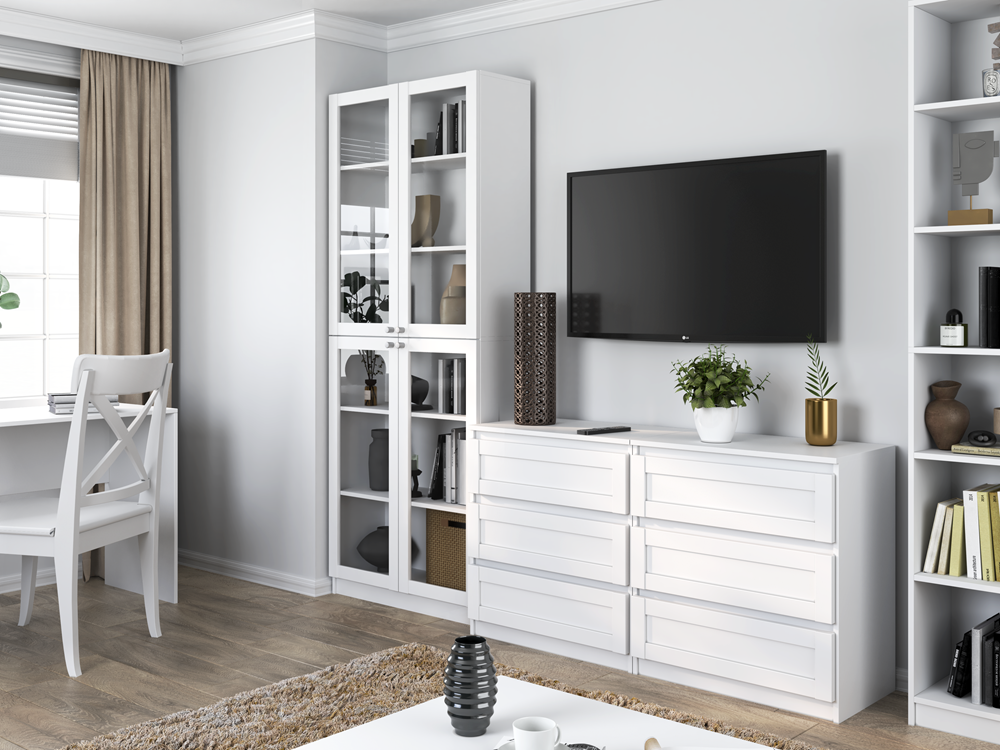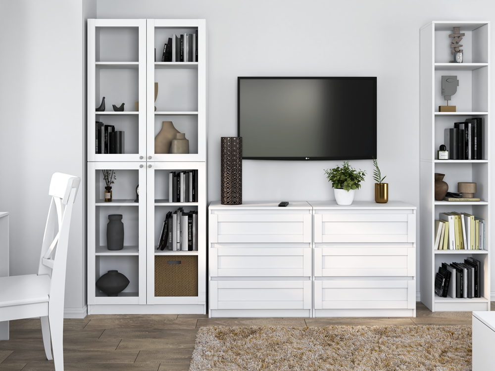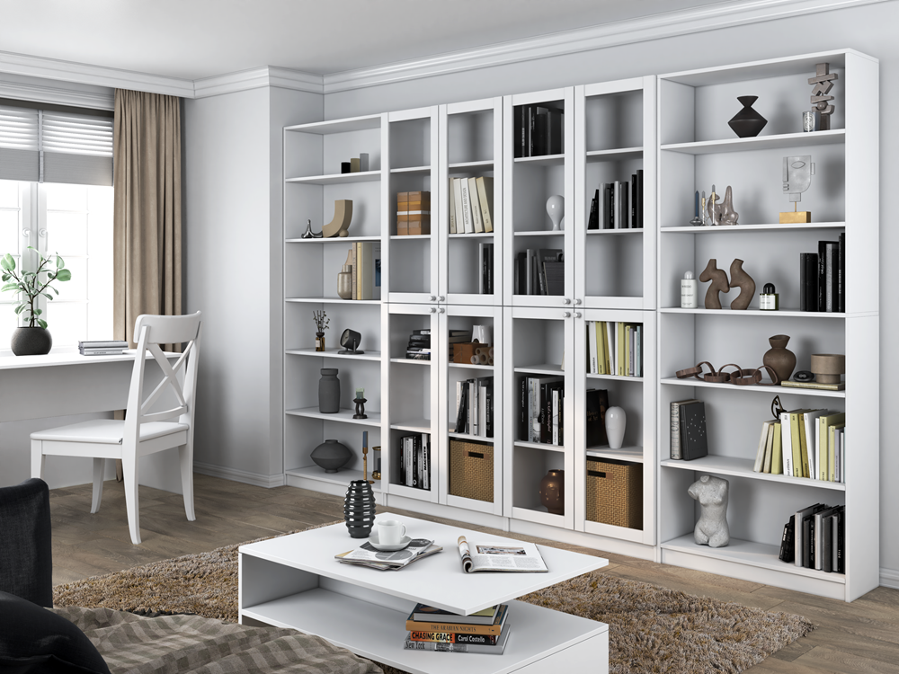 Za prosklenými dveřmi se nachází 6 prostorných polic, které umožňují efektivní uspořádání různých předmětů – od knih a dokumentů po dekorace.