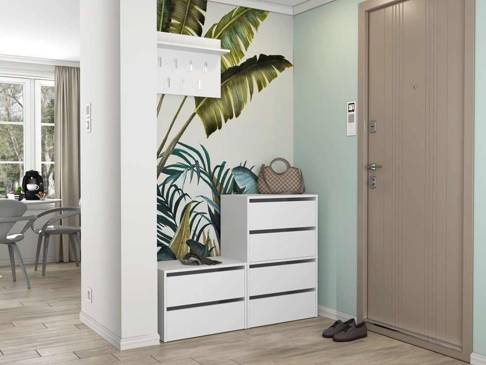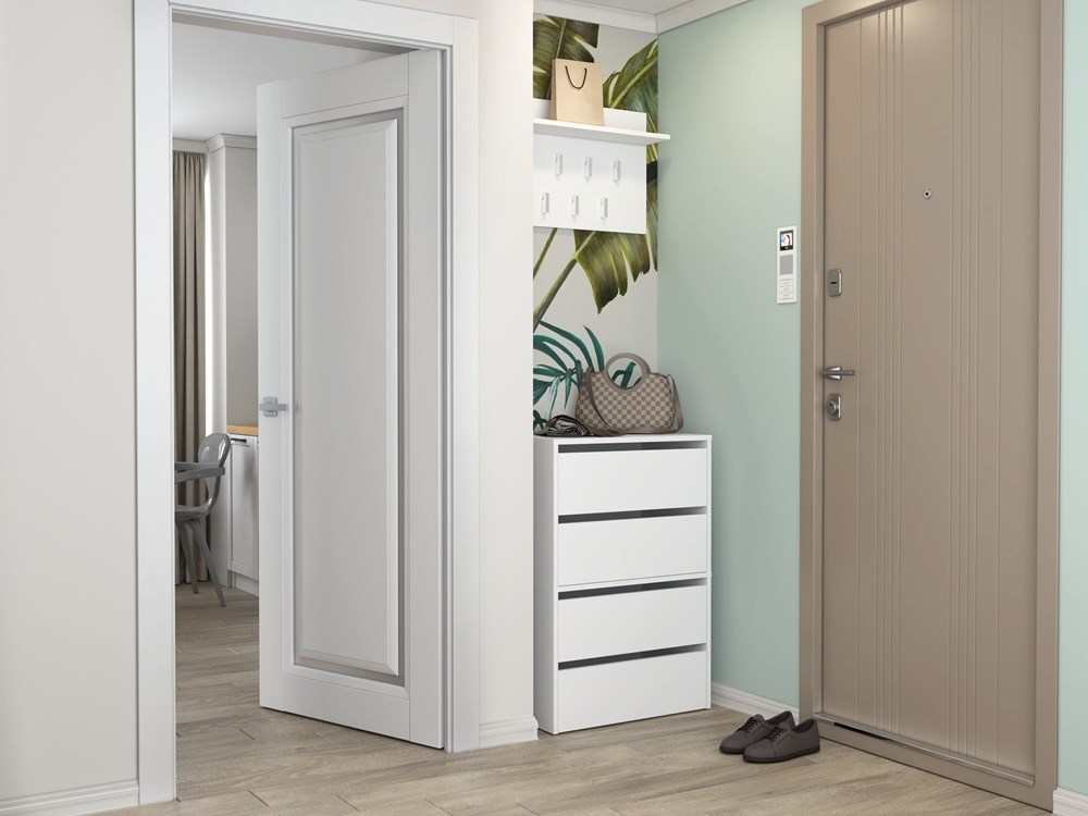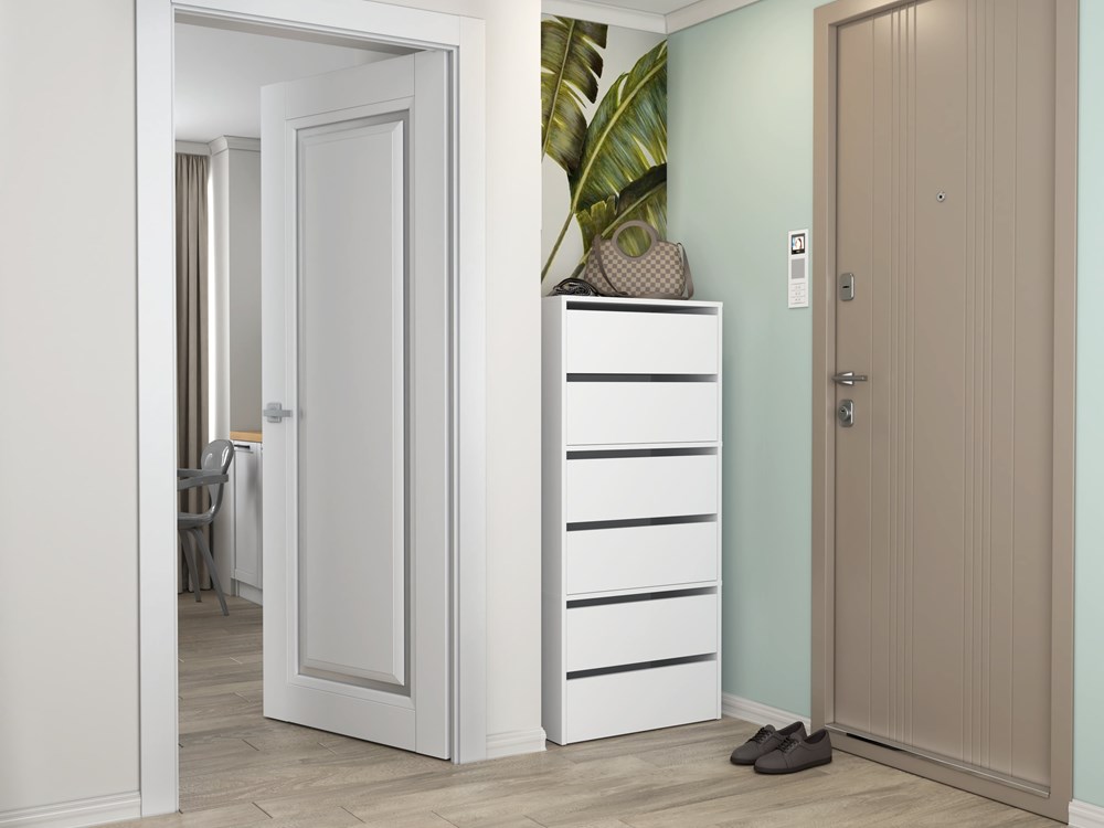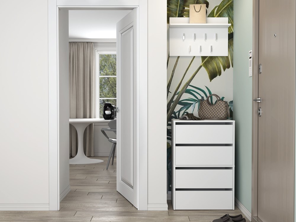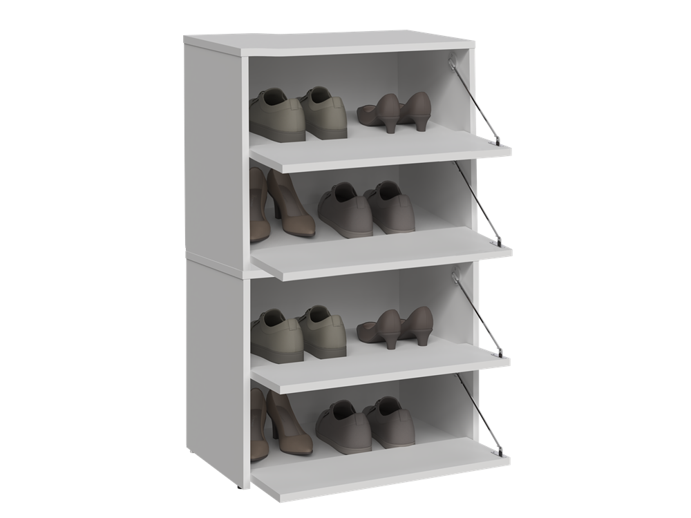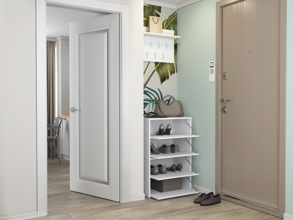 Za dvířky se nacházejí 4 prostorné police na obuv.